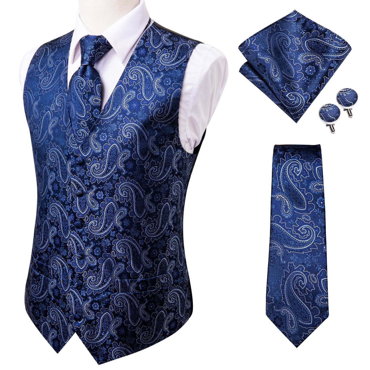 Blue Paisley Silk Men's Vest Hanky Cufflinks Tie Set Waistcoat Suit Set