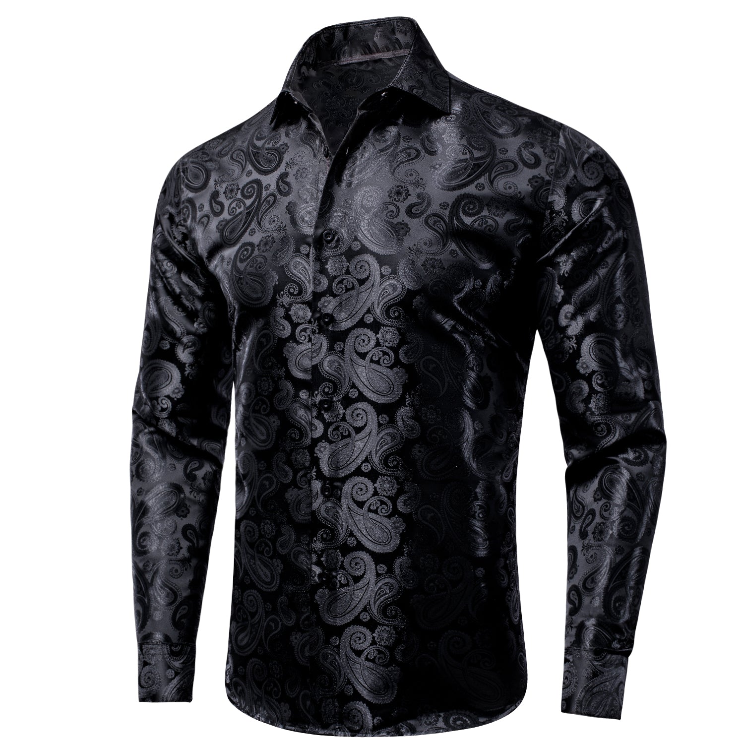 Hi-Tie Black Men Shirt Black Paisley Silk Men Long Sleeve Shirt Casual
