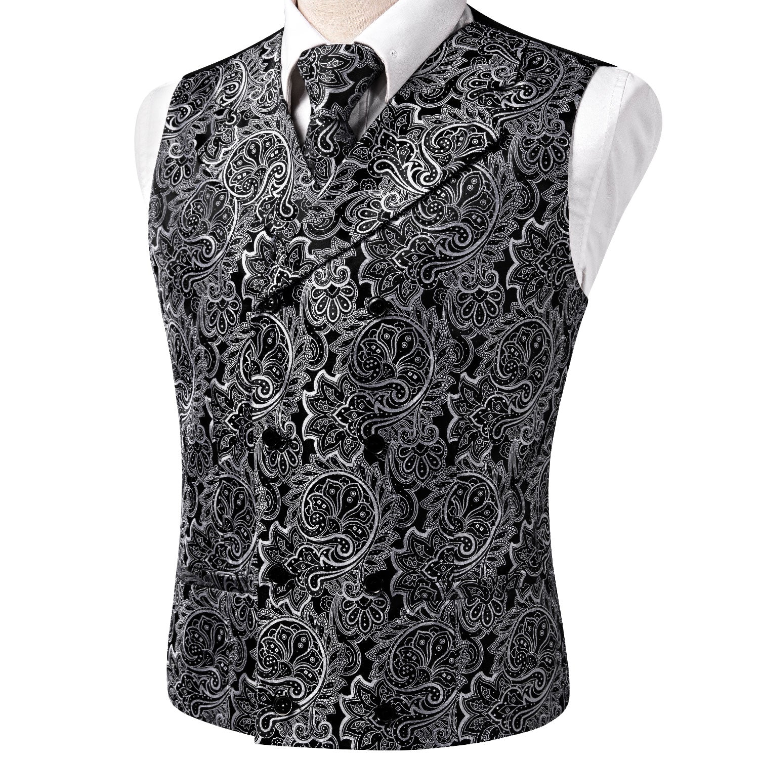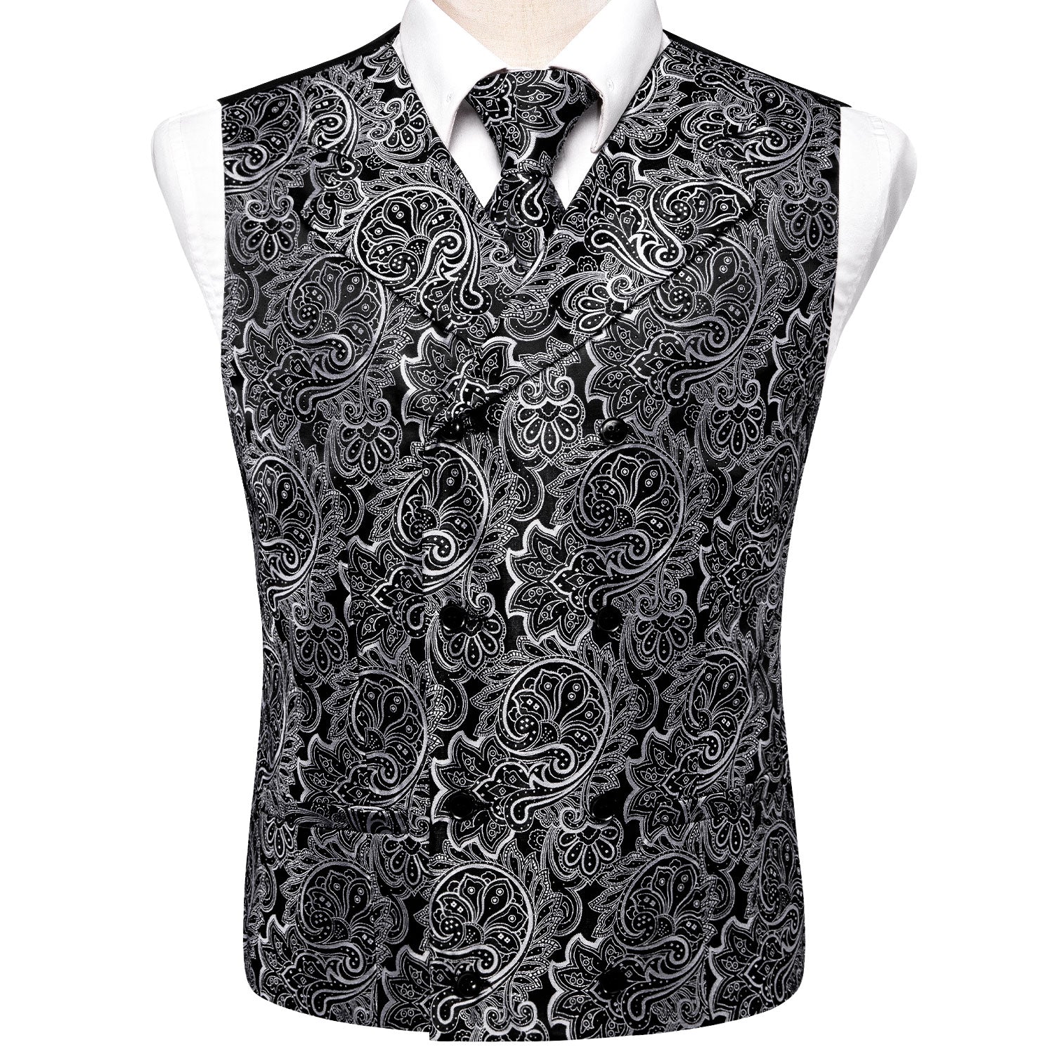 Black White Paisley Silk Men's Vest Hanky Cufflinks Tie Set Waistcoat Suit Set