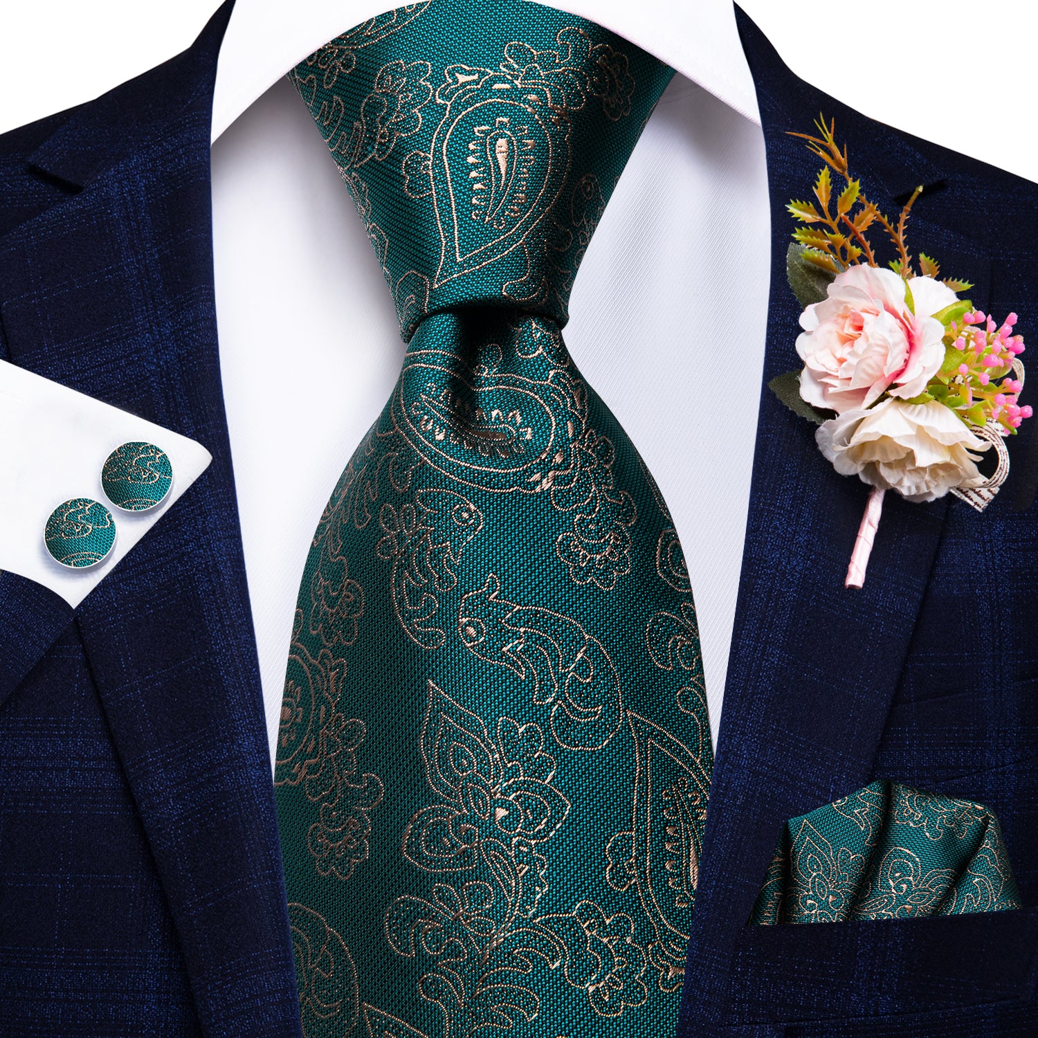 Teal Green floral Tie Handkerchief Cufflinks Set with Wedding Brooch