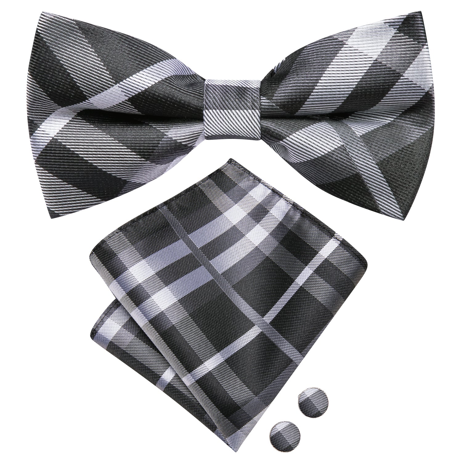 Hi-Tie Men's Black Grey Plaid Pre-tied Bow Tie Hanky Cufflinks Set