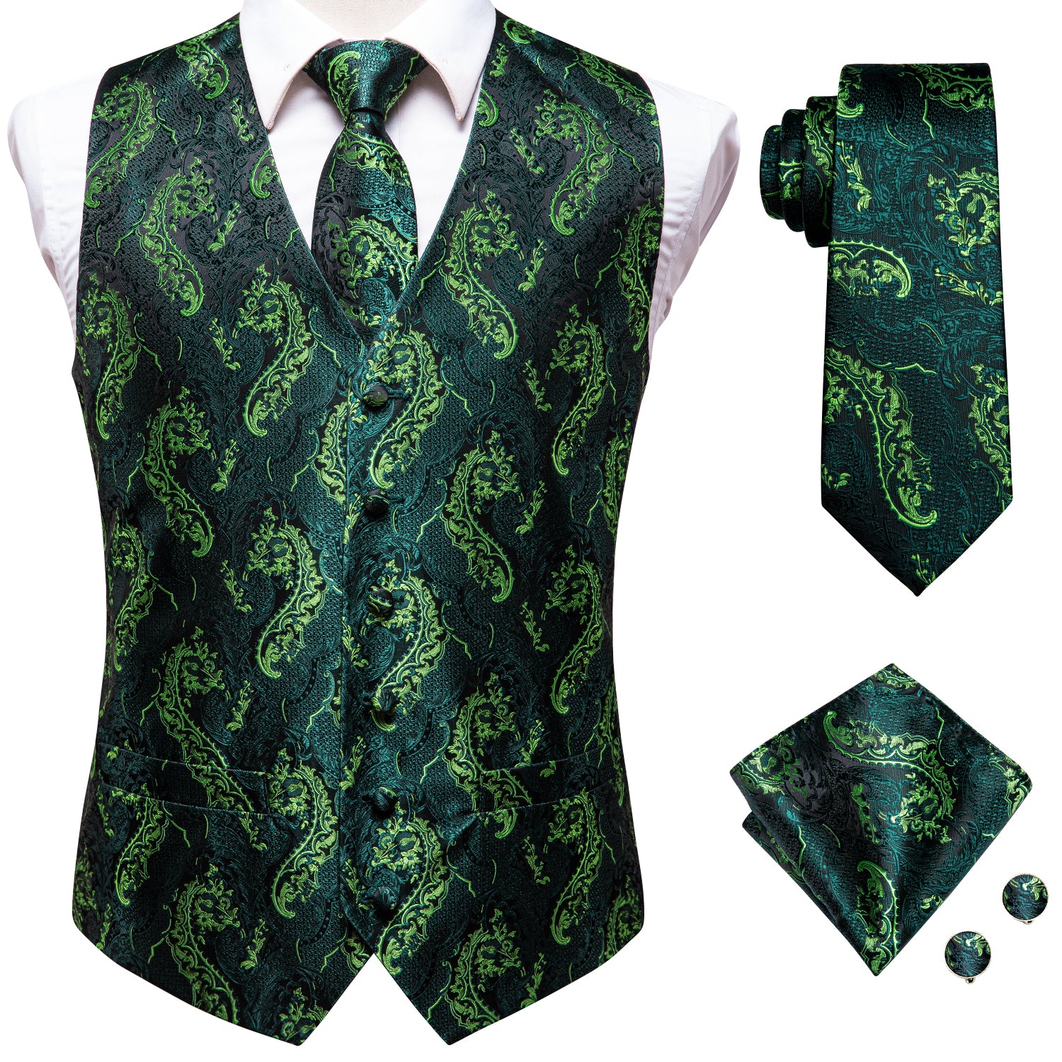 Green Paisley Silk Men's Vest Hanky Cufflinks Tie Set Waistcoat Suit Set
