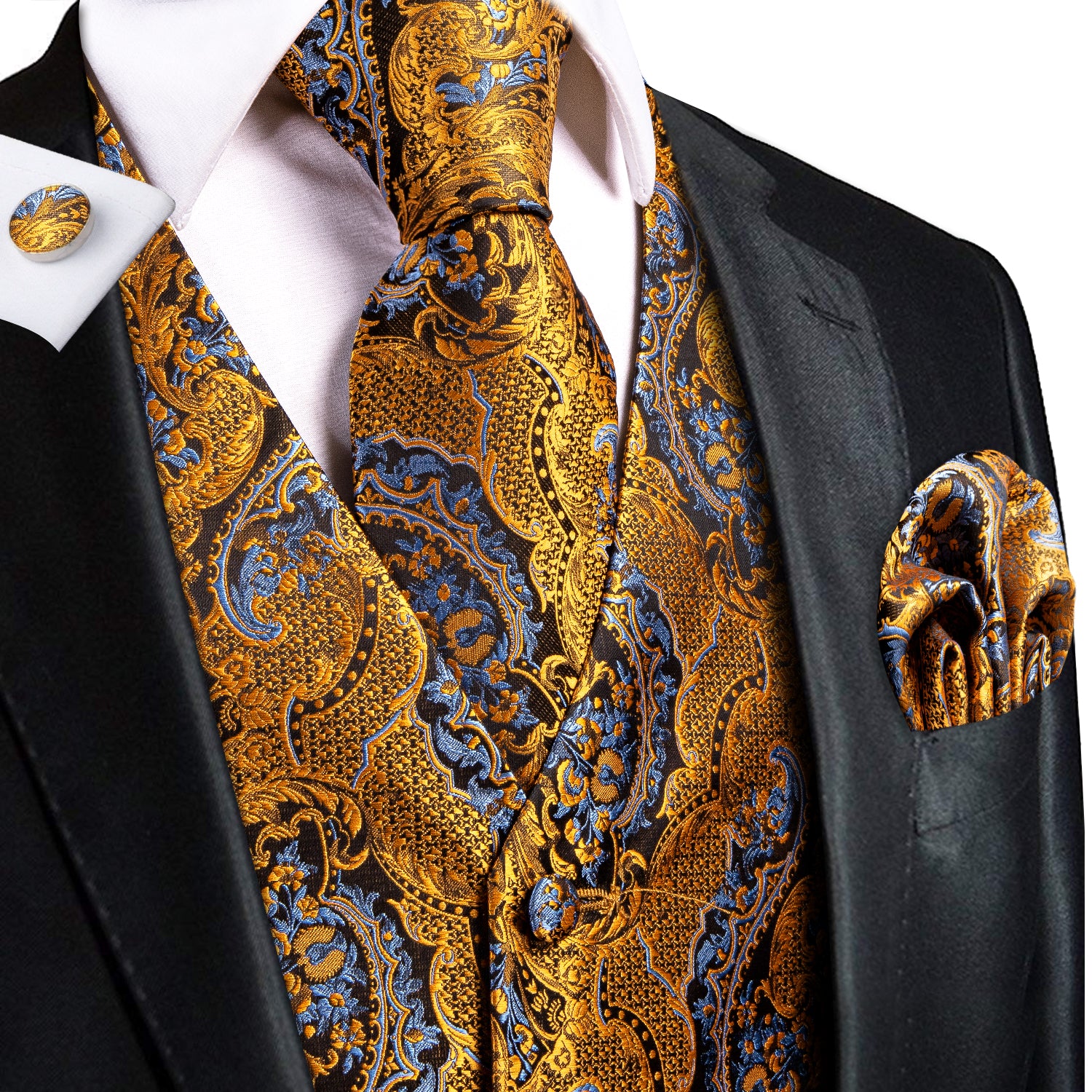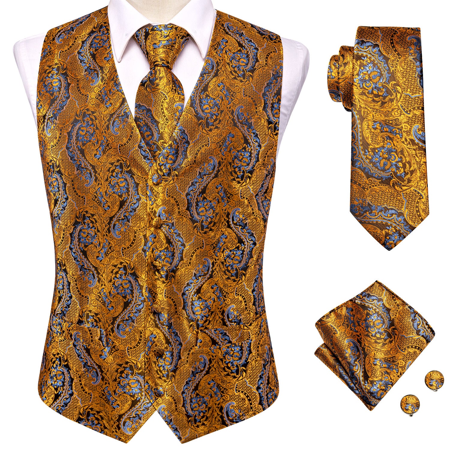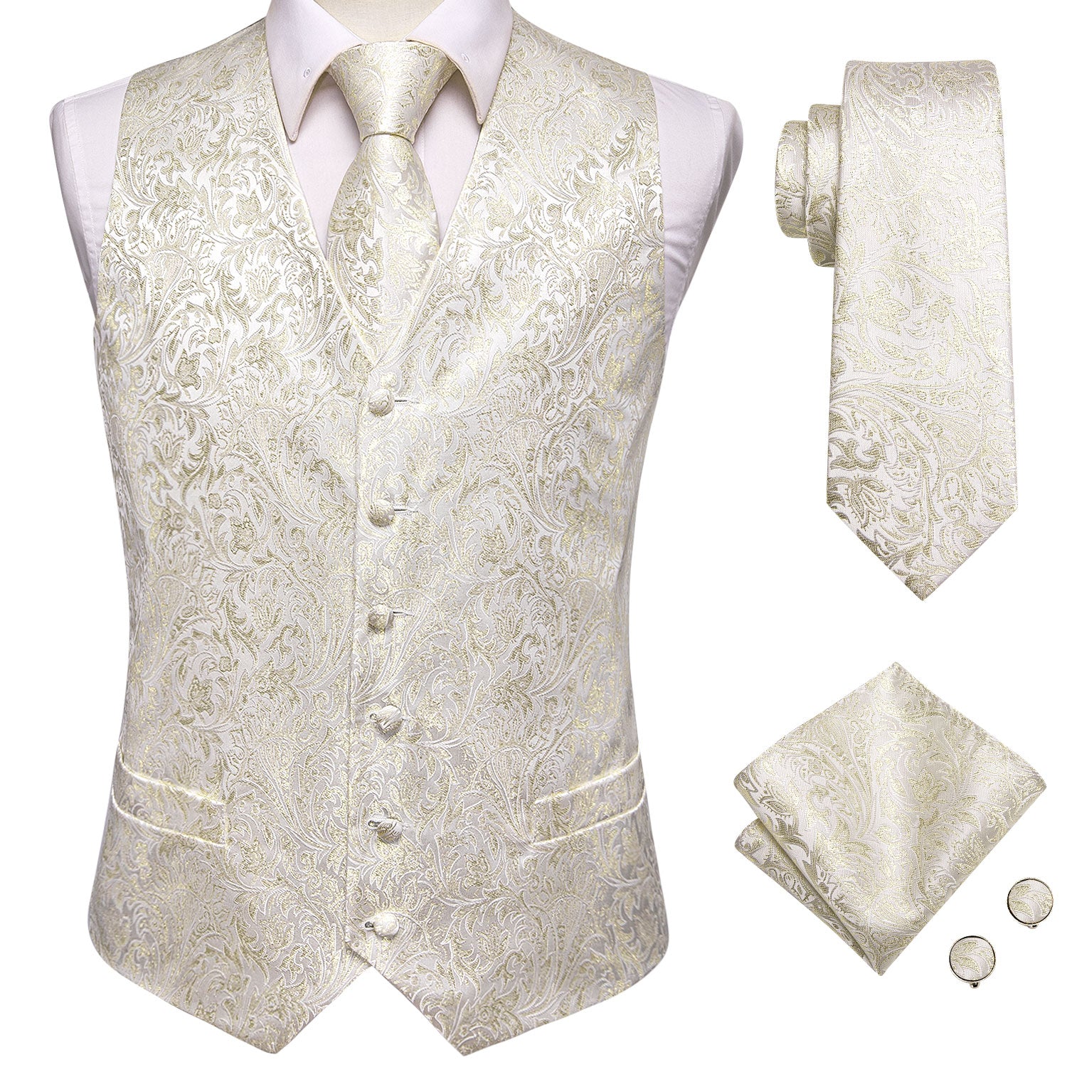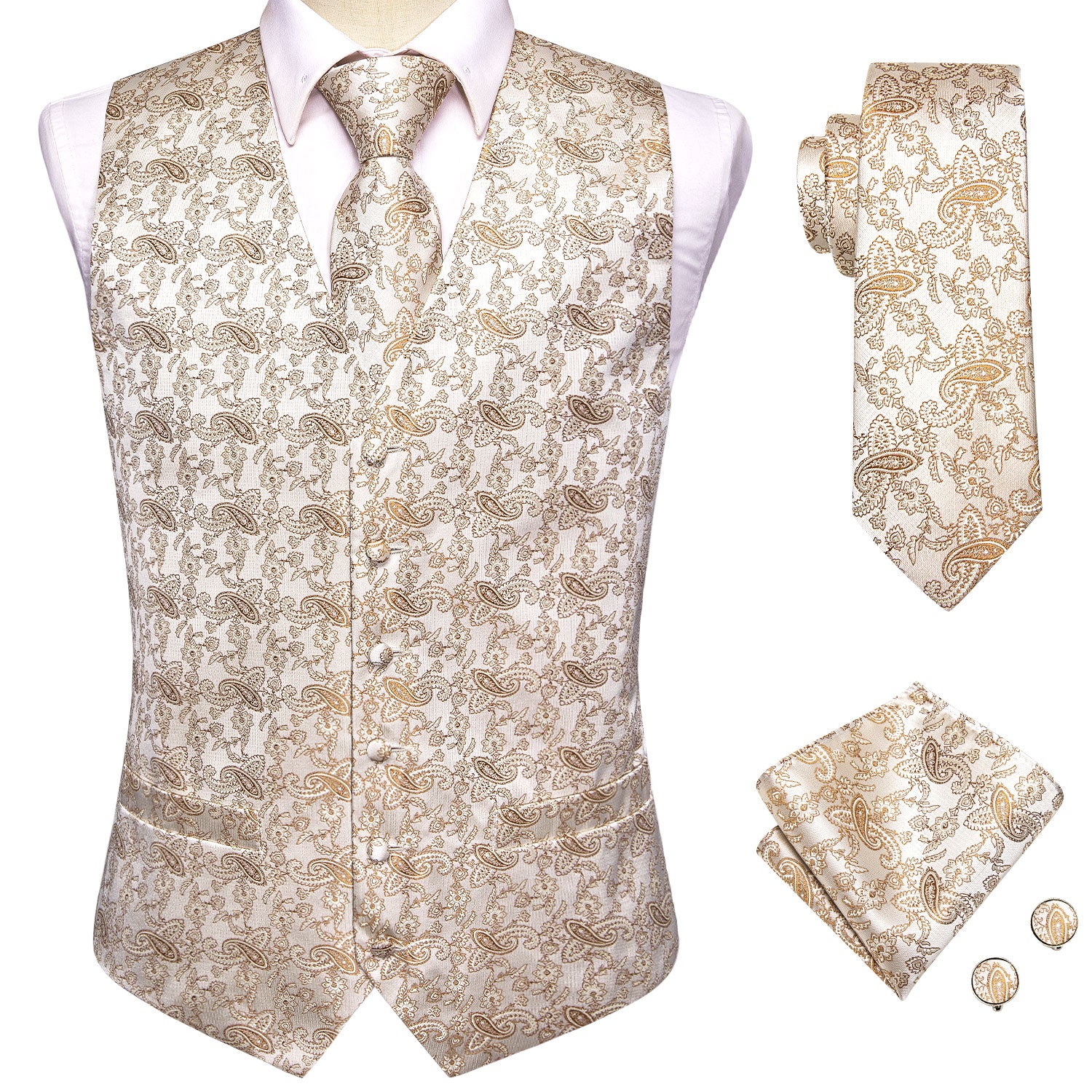Champagne Paisley Silk Men's Vest Hanky Cufflinks Tie Set Waistcoat Suit Set