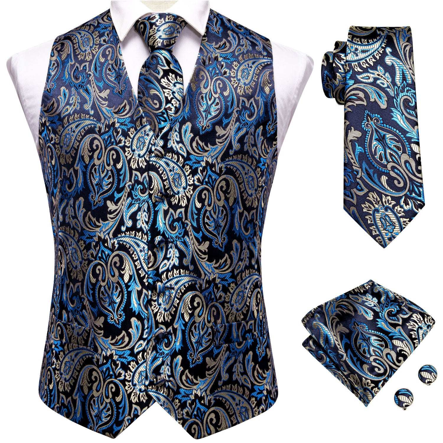 Blue Paisley Silk Men's Vest Hanky Cufflinks Tie Set Waistcoat Suit Set