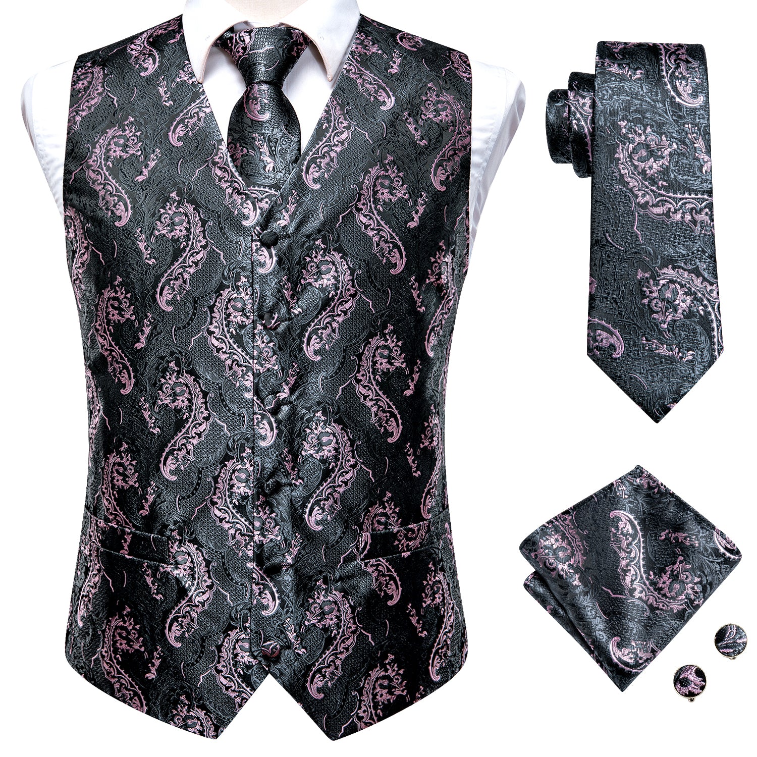 Grey Pink Paisley Silk Men's Vest Hanky Cufflinks Tie Set Waistcoat Suit Set