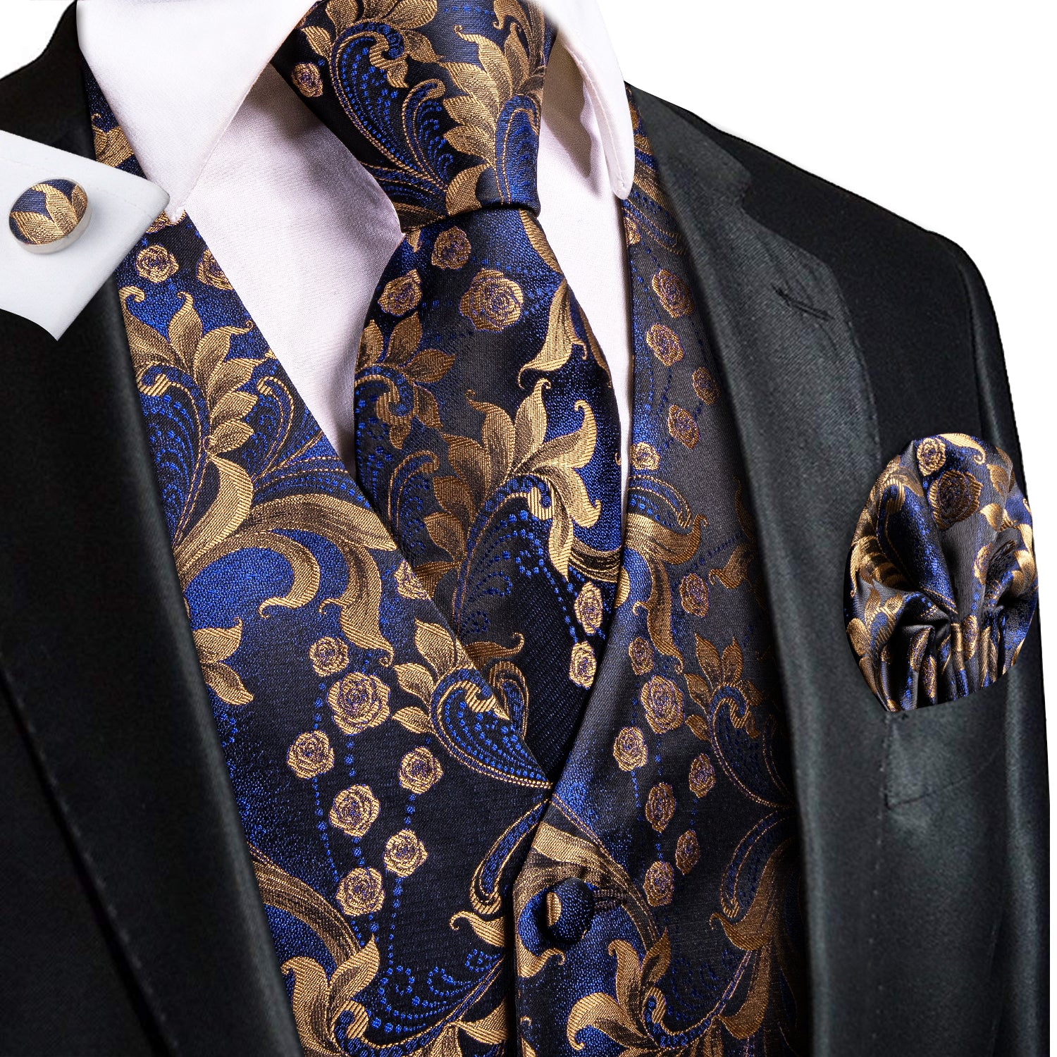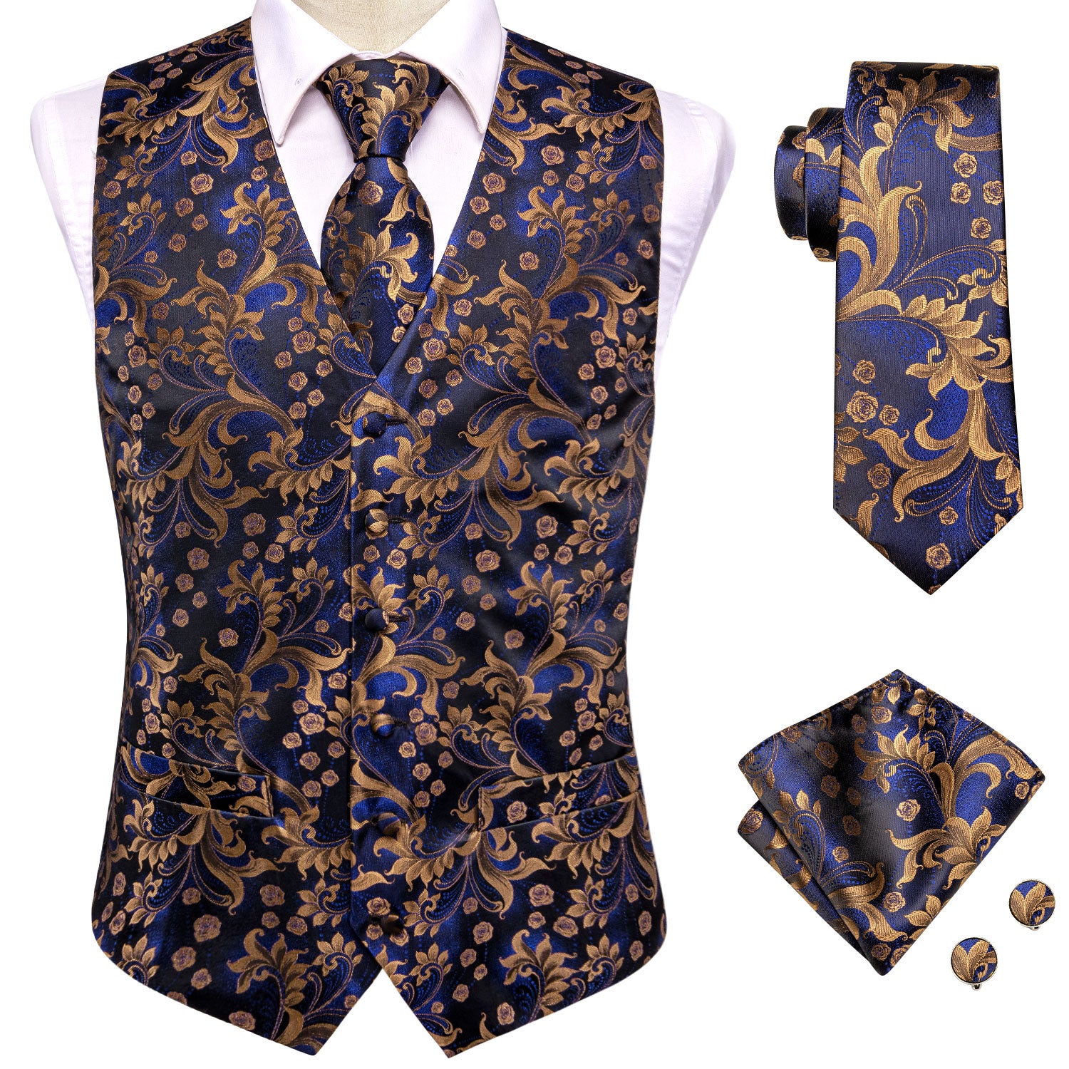 Blue Green Floral Silk Men's Vest Hanky Cufflinks Tie Set Waistcoat Suit Set