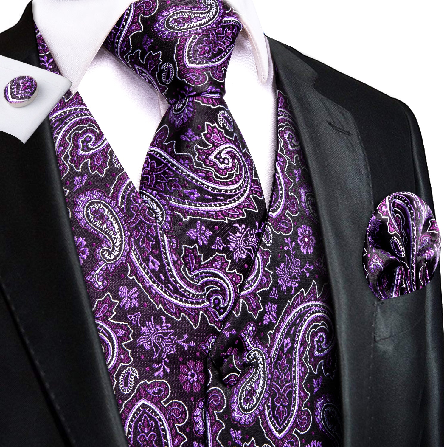 Purple Black Floral Silk Men's Vest Hanky Cufflinks Tie Set Waistcoat Suit Set