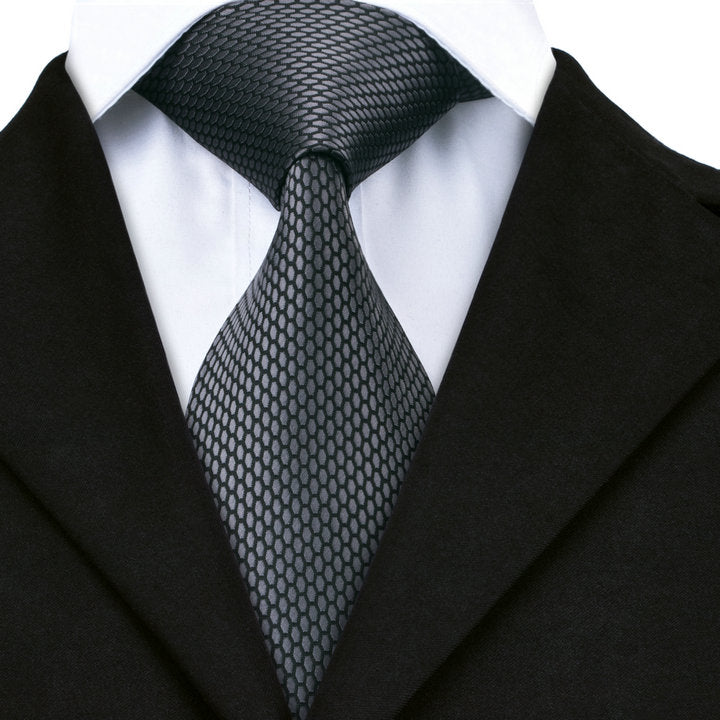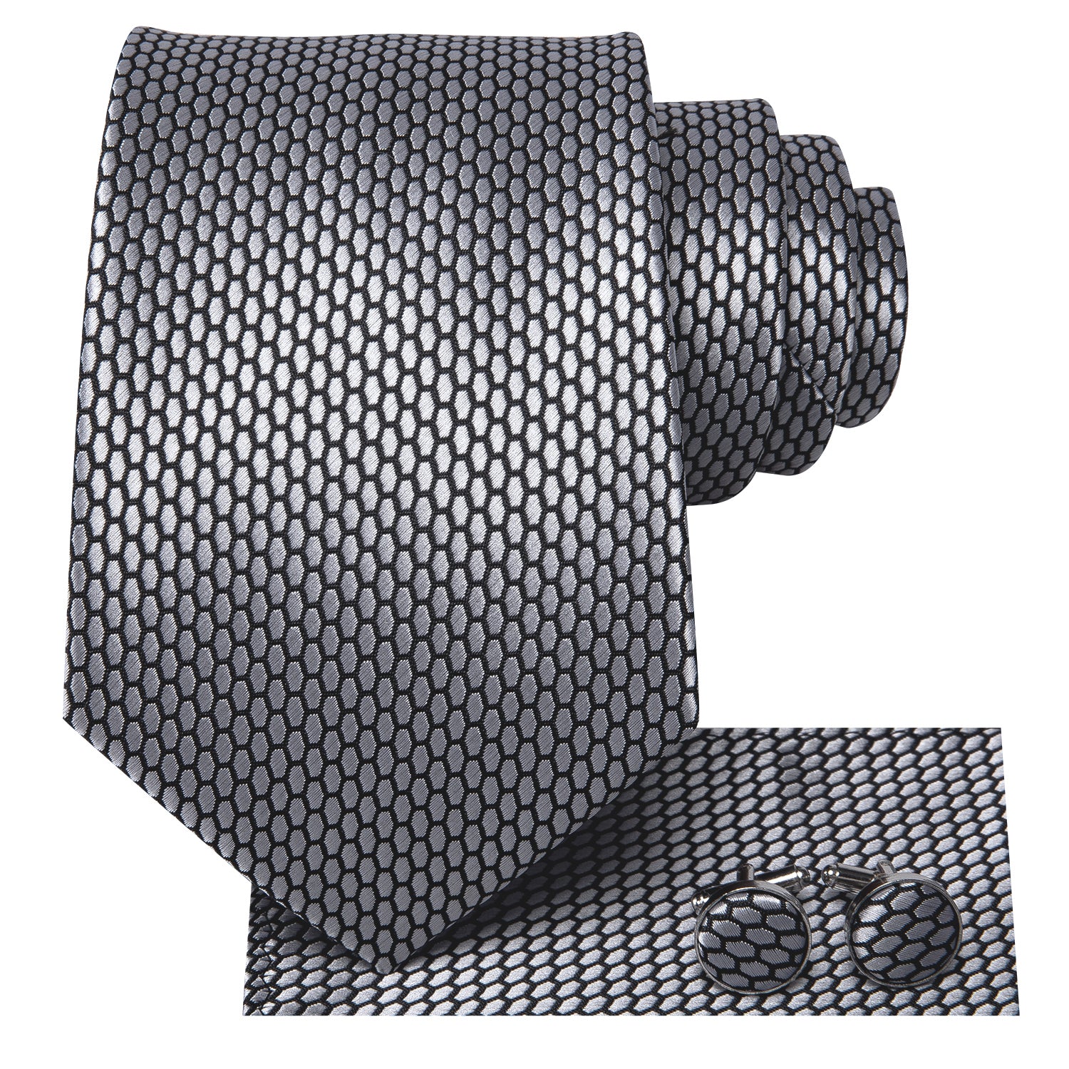 Hi-Tie Gray Black Neckties Geometric Tie Pocket Square Cufflinks Set