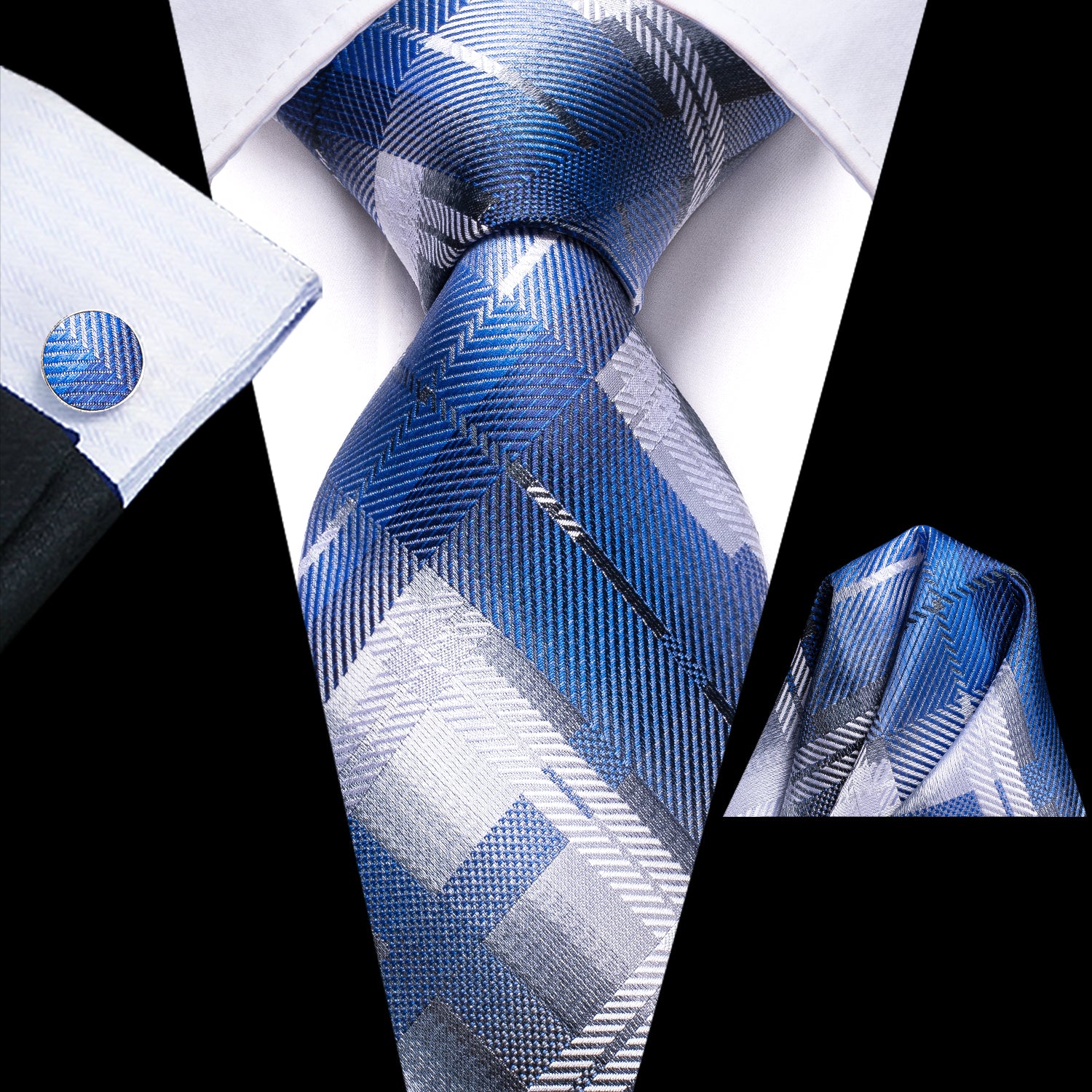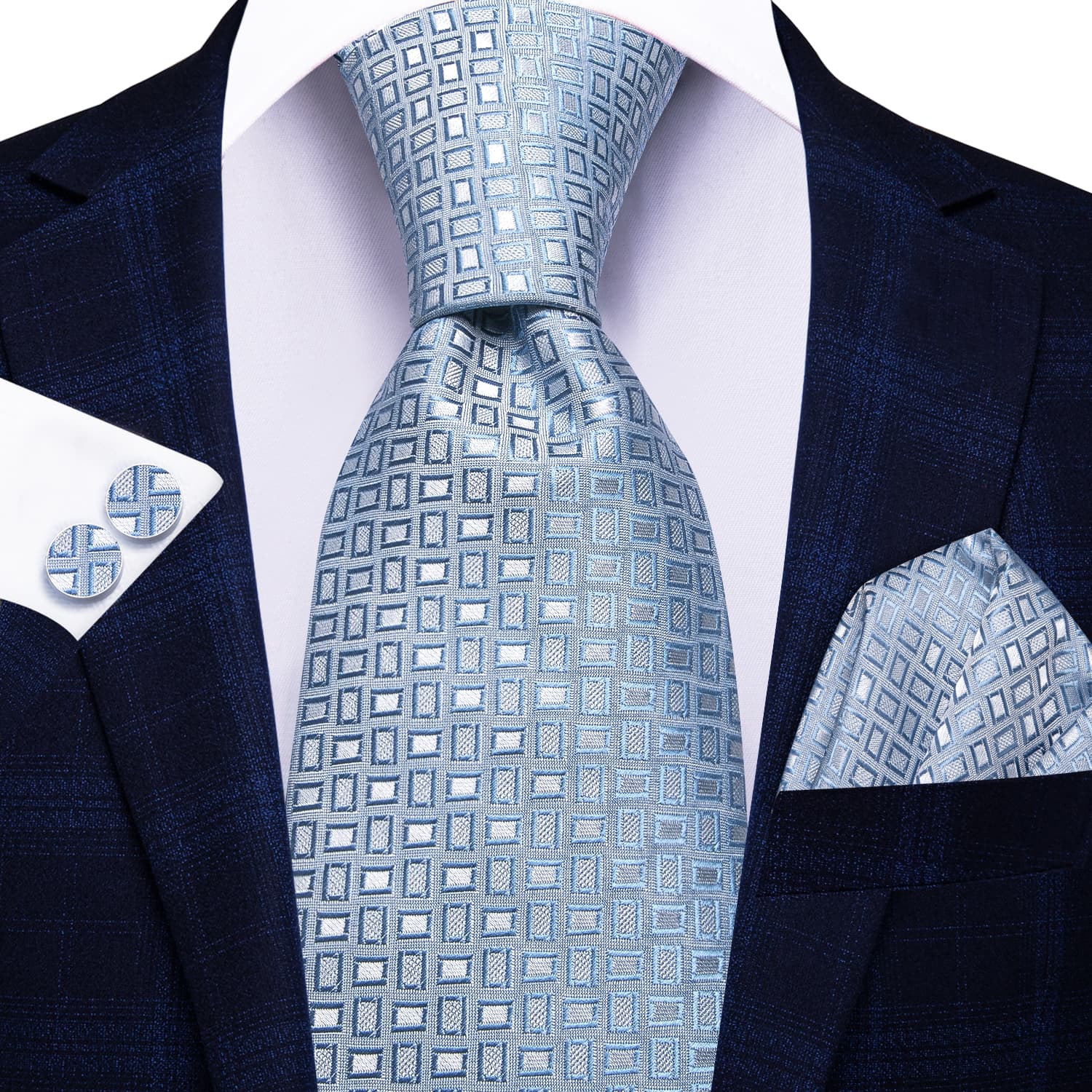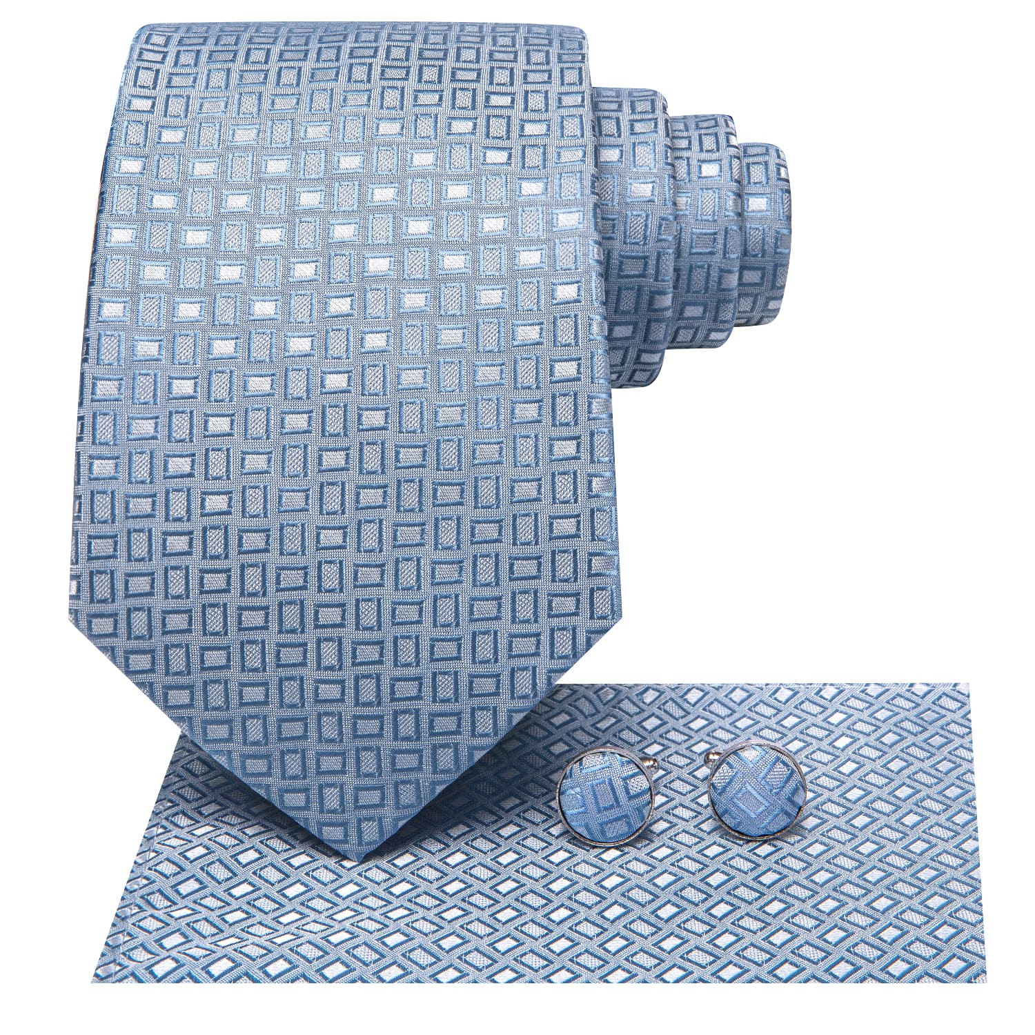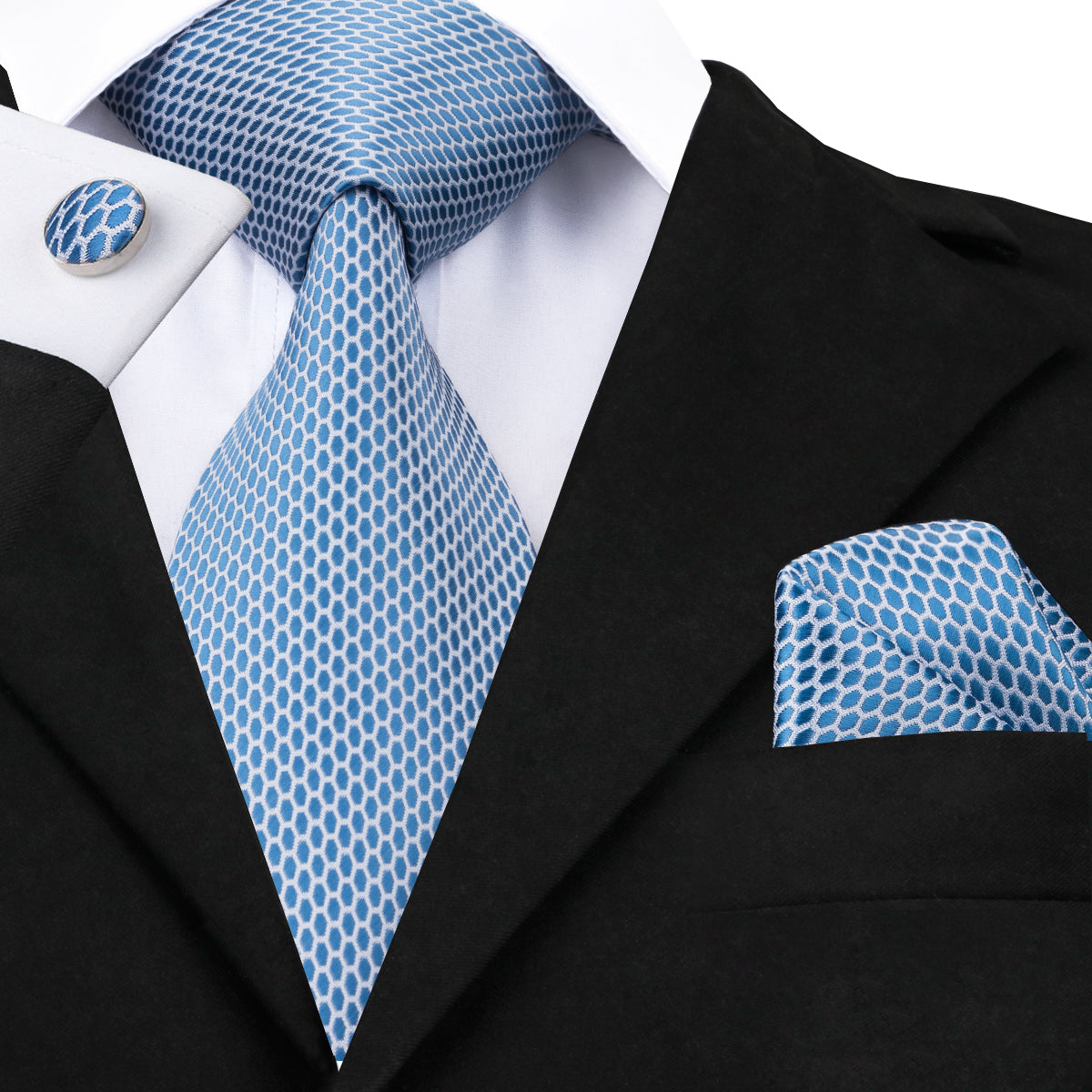 Hi-Tie Sky Blue Necktie Geometric Mens Tie Pocket Square Cufflinks Set