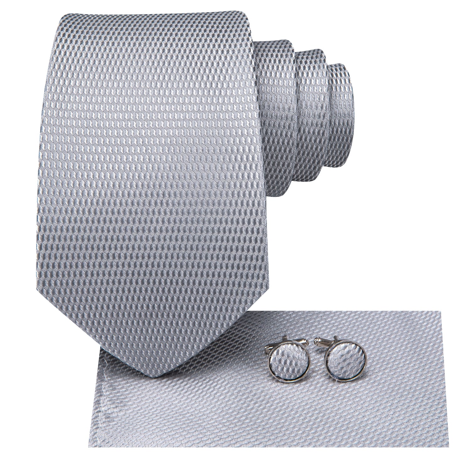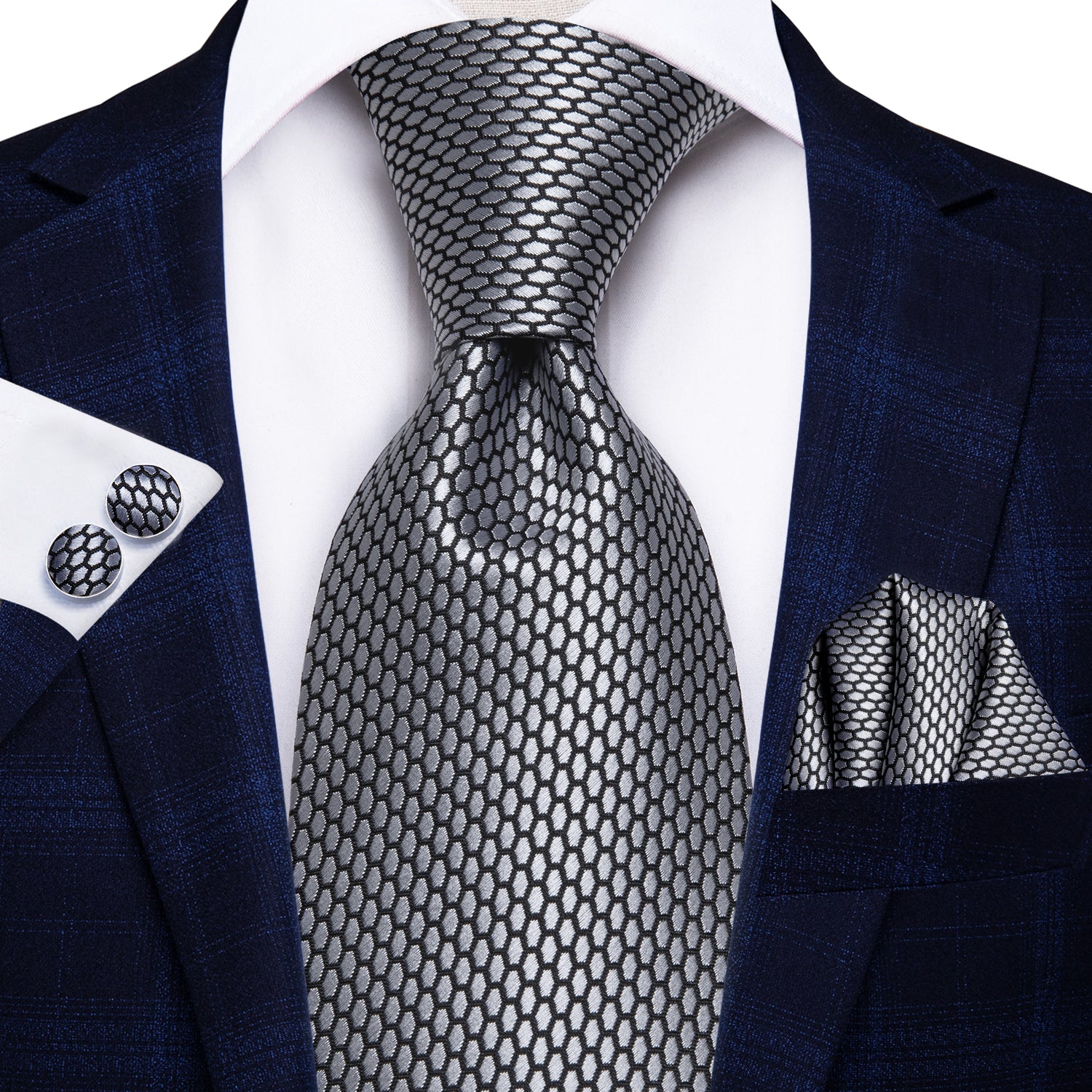 Hi-Tie Grey Geometric Men's Tie Pocket Square Cufflinks Set