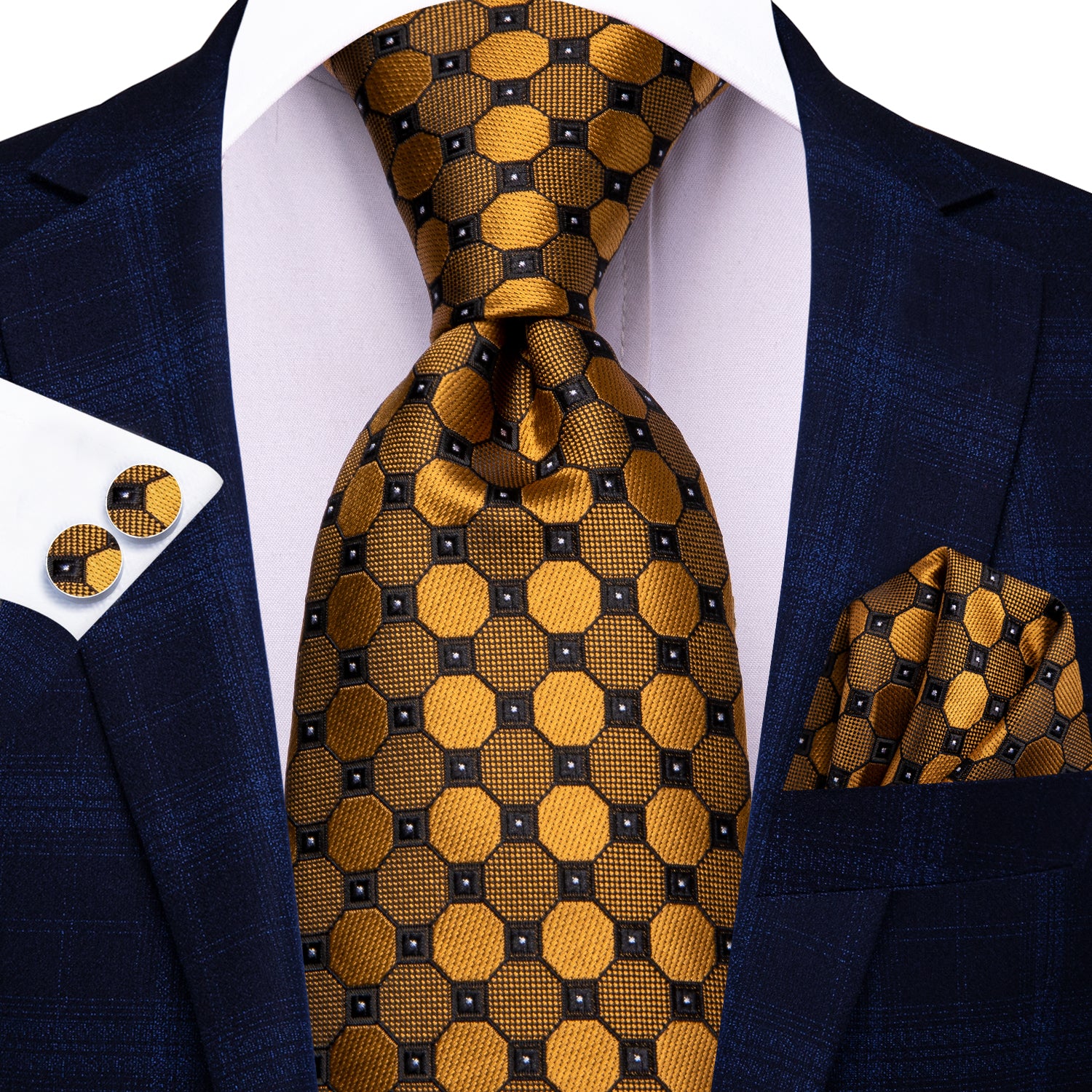 Hi-Tie Golden Geometric Dot 67 Inch Extra Long Tie Hanky Cufflinks Set
