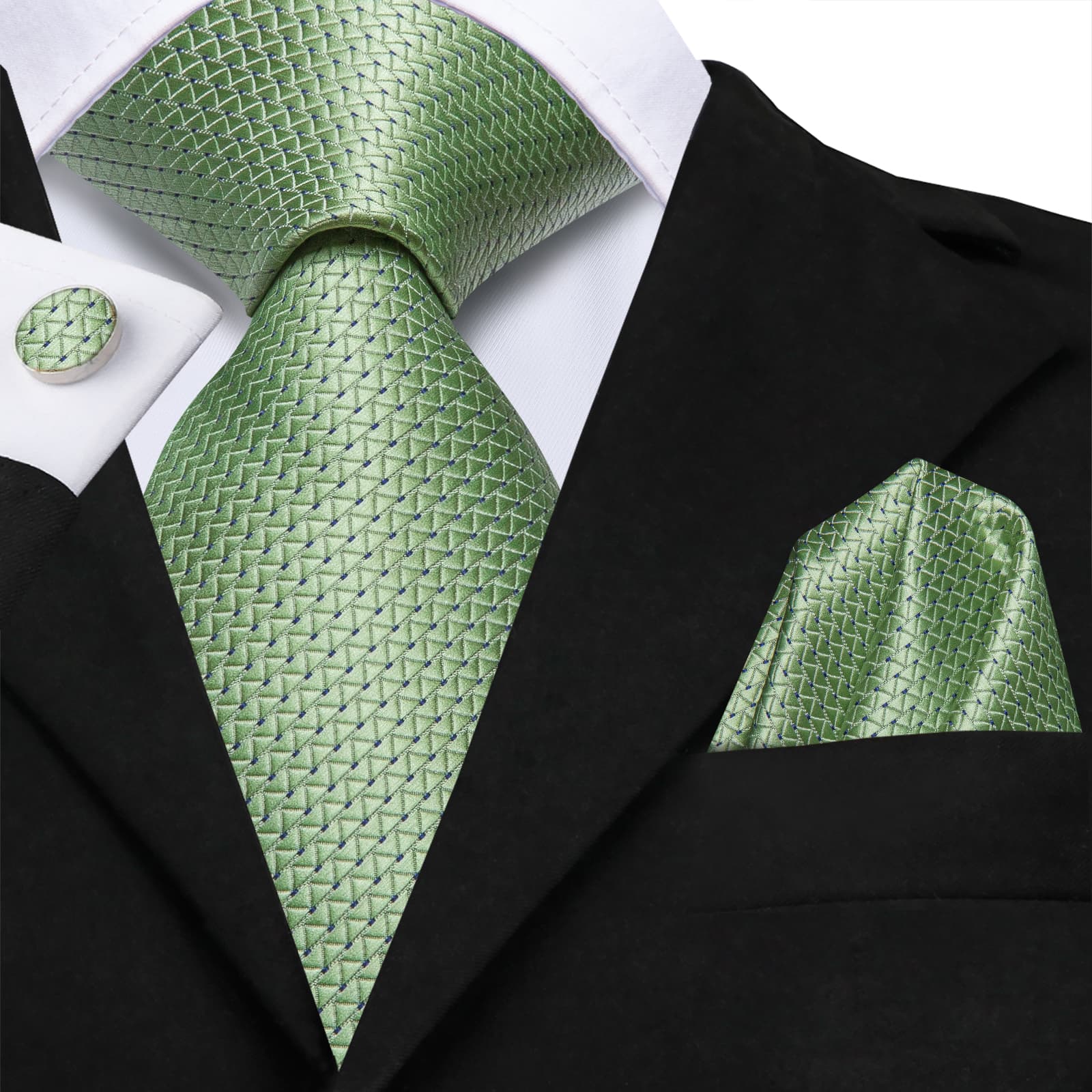 Hi-Tie Light Green Necktie Asparagus Geometric Tie Hanky Cufflinks Set