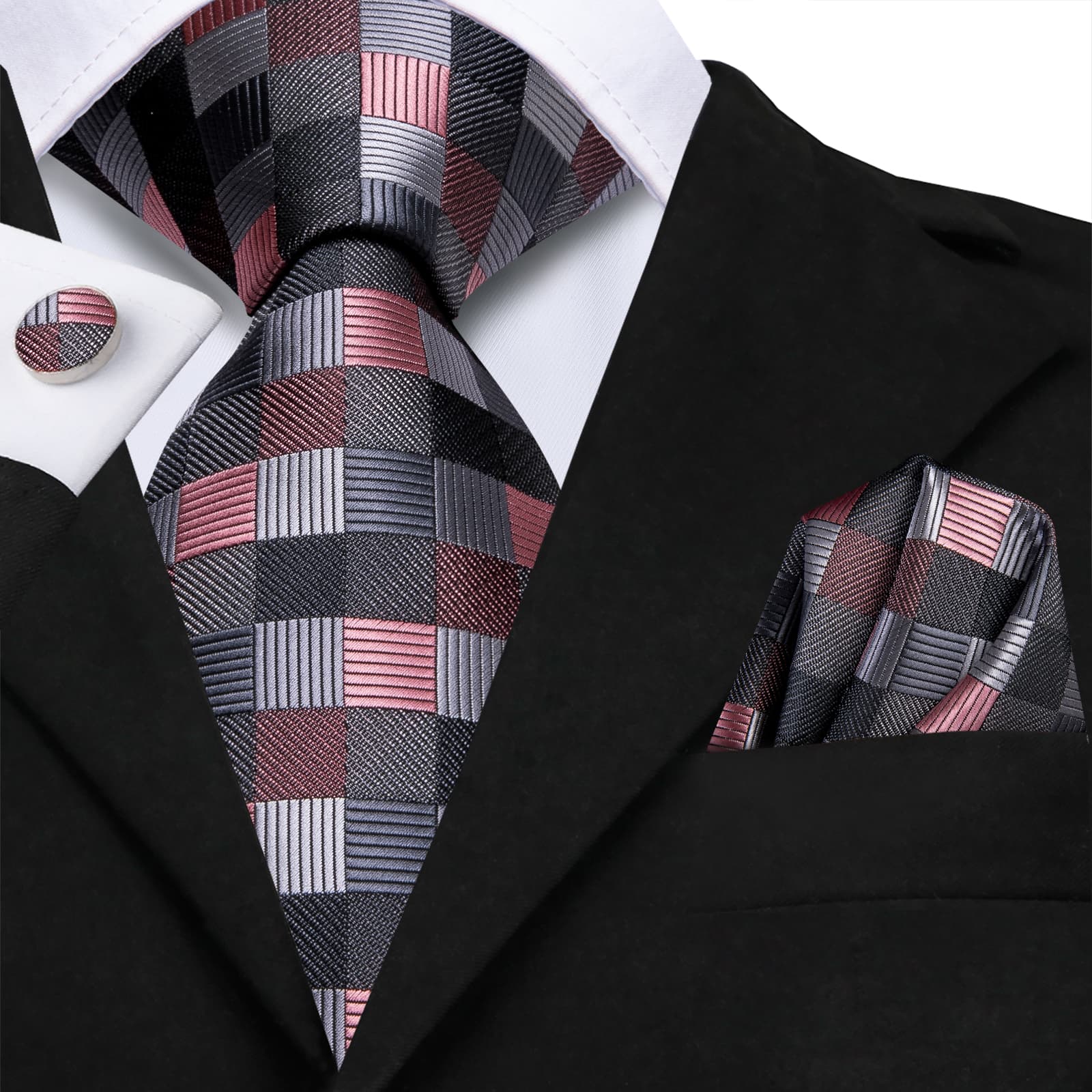 Hi-Tie Black Grey Coral Red Plaid Jacquard Geometric Men's Necktie Set