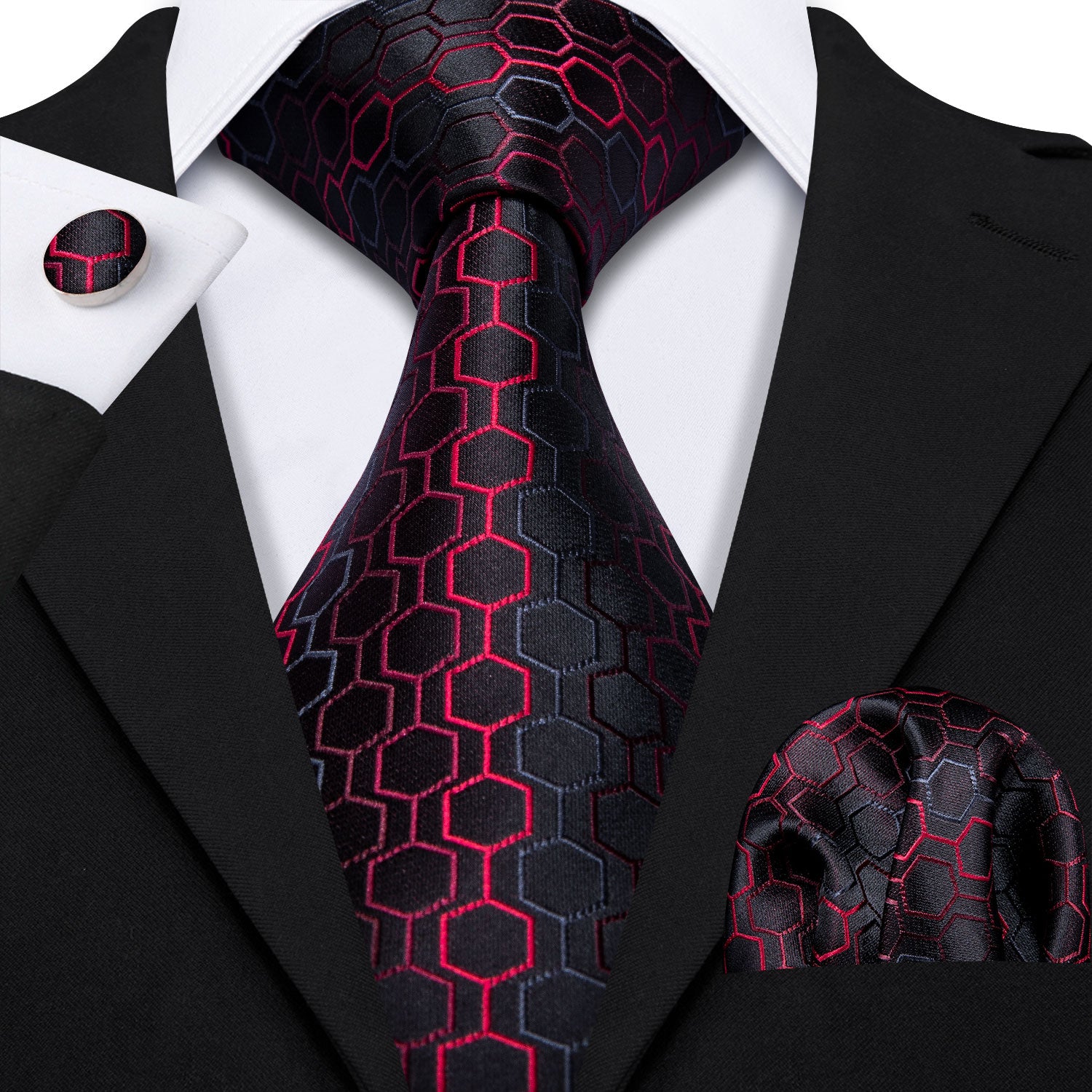 Hi-Tie Black Red Geometric Plaid Silk Tie Pocket Square Cufflinks Set