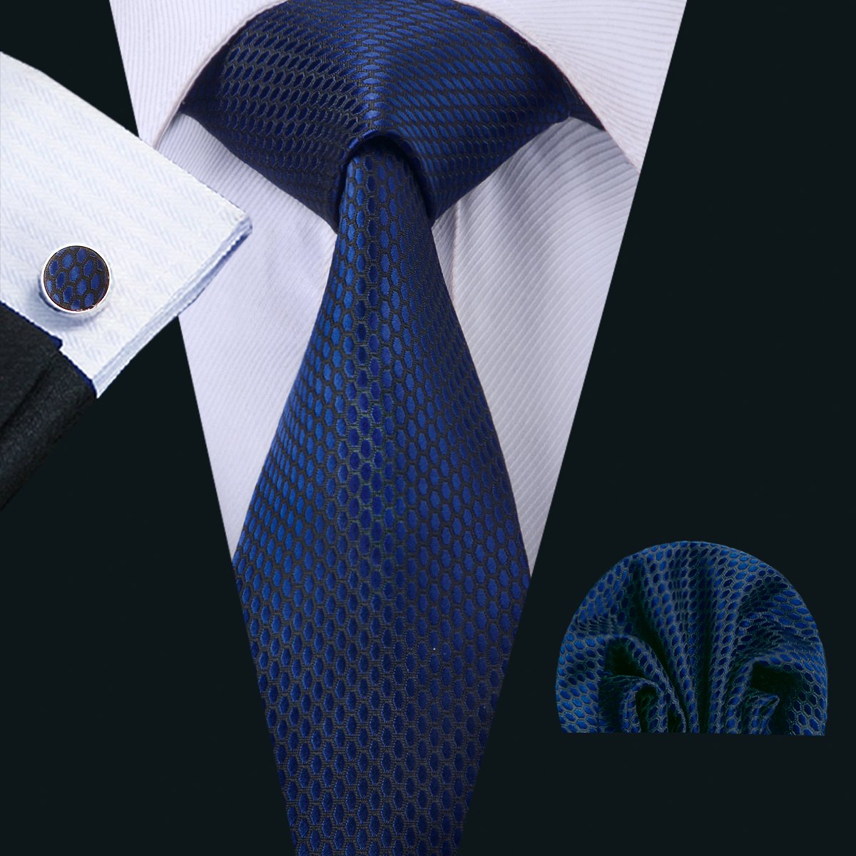 Hi-Tie Men's Blue Tie Geometric Necktie Pocket Square Cufflinks Set