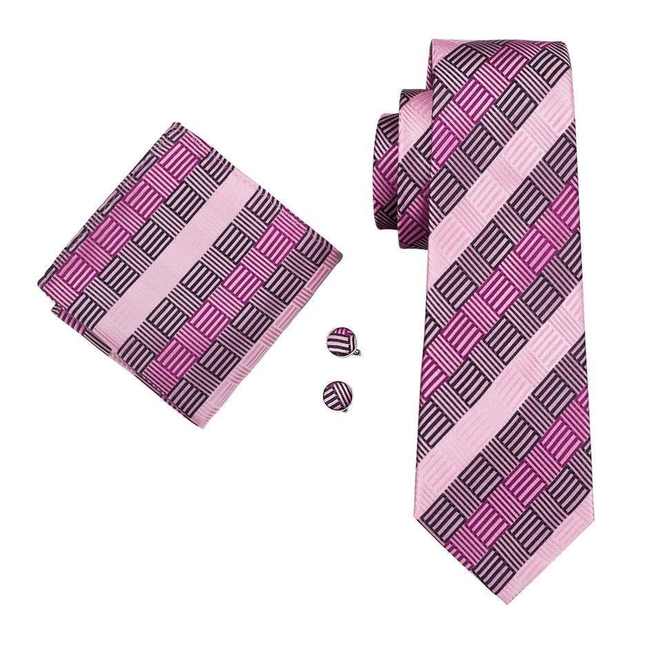 Hi-Tie Blush Pink Tie Geometric Plaid Tie Pocket Square Cufflinks Set