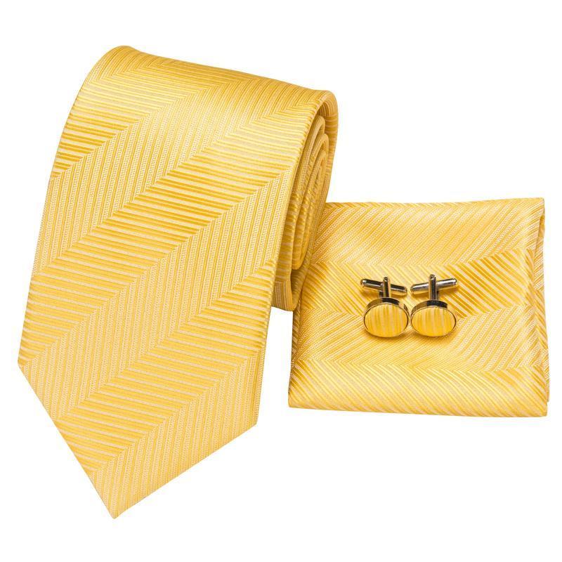 Hi-Tie Men Necktie Yellow Color Striped Tie Handkerchief Cufflinks Set