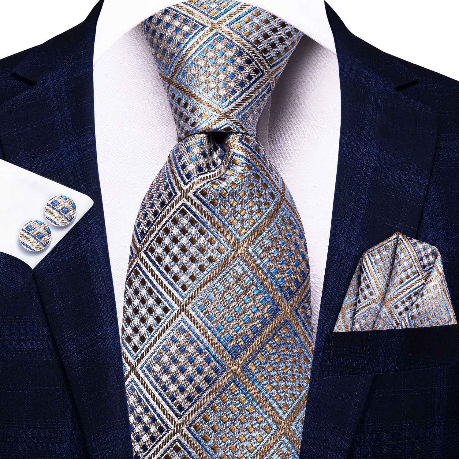 Hi-Tie Deep Blue Tie Gold Dots Plaid Tie Pocket Square Cufflinks Set