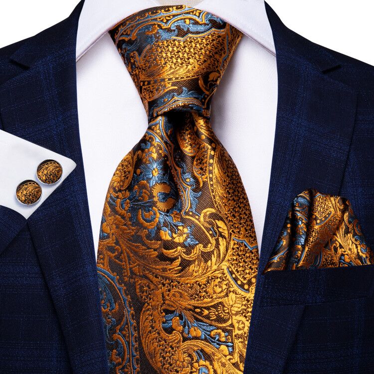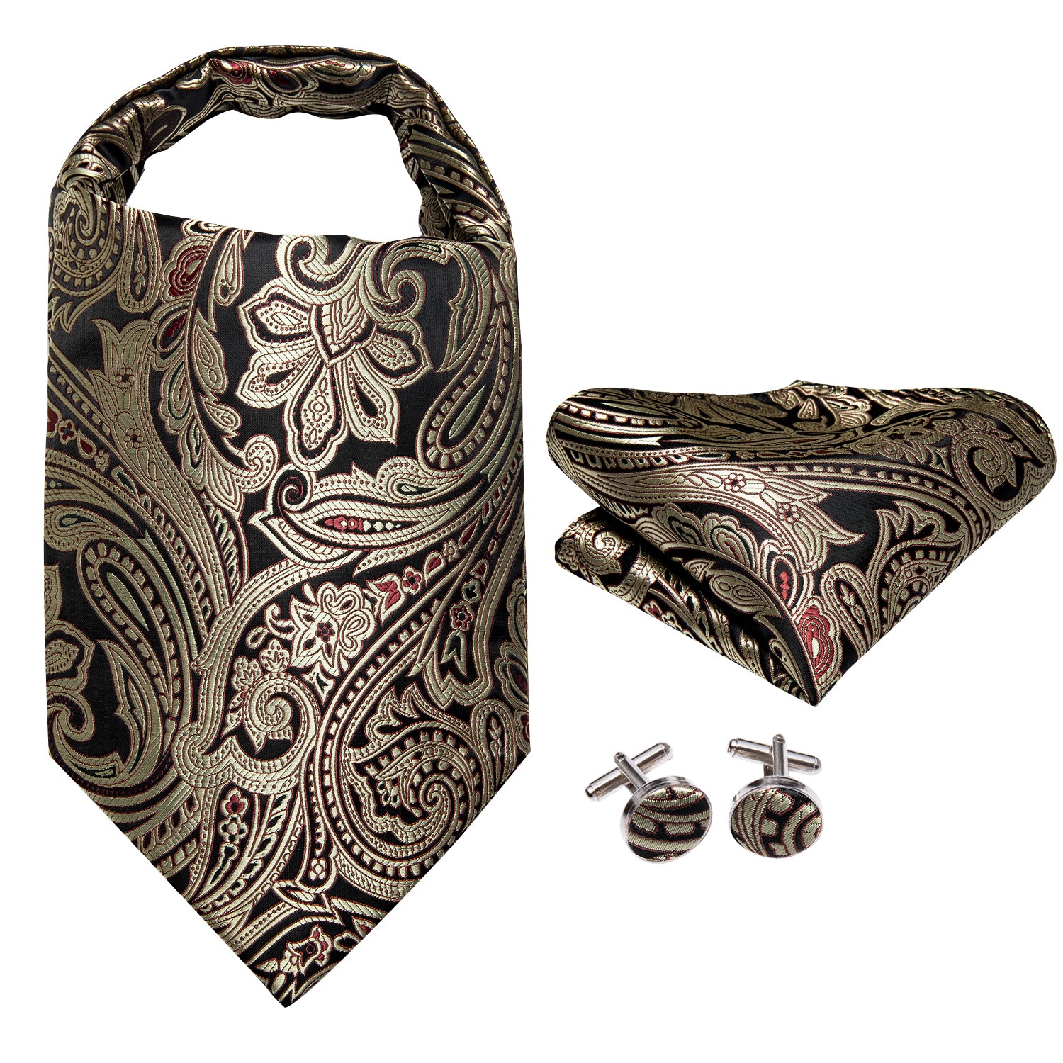 Gold Paisley Silk Ascot Tie Pocket Square Cufflinks Set
