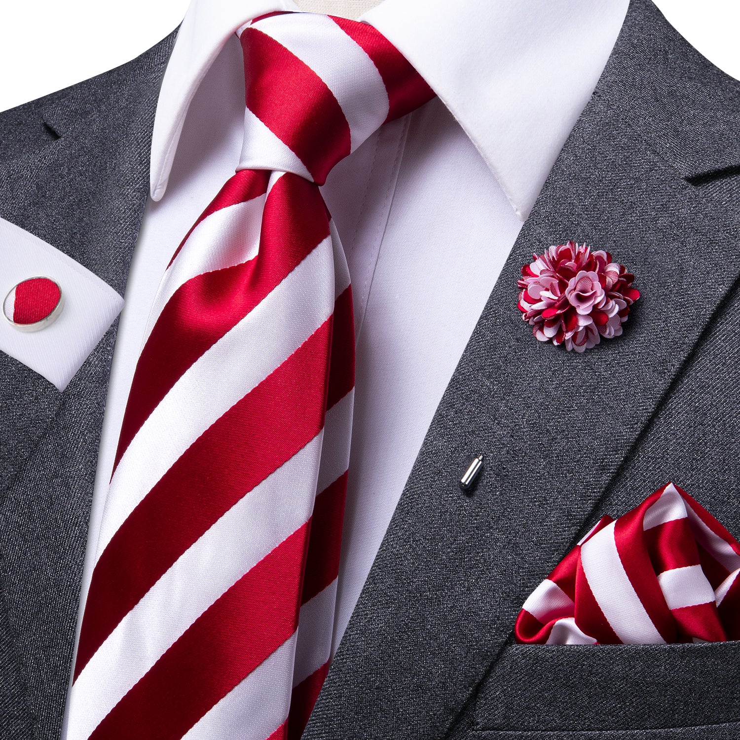 Hi-Tie Red White Striped Tie Pocket Square Cufflinks Set with Brooch