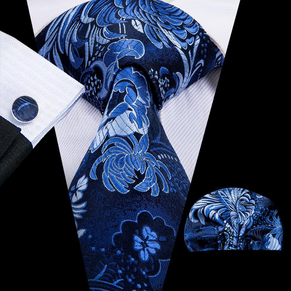 Hi-Tie Men's Wedding Blue Floral Necktie Handkerchief Cufflinks Set