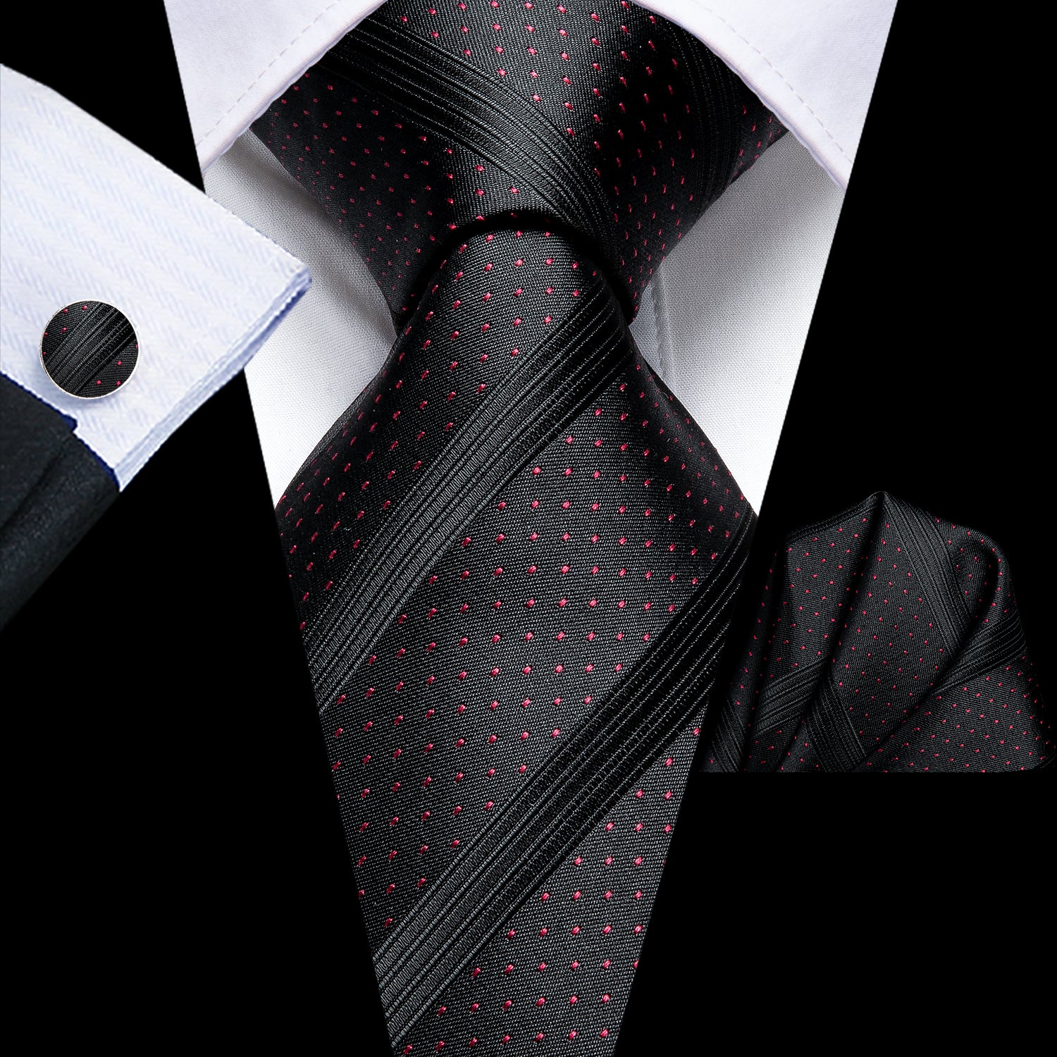 Hi-Tie Black Men's Tie Red Polka Dots Silk Necktie Hanky Cufflinks Set