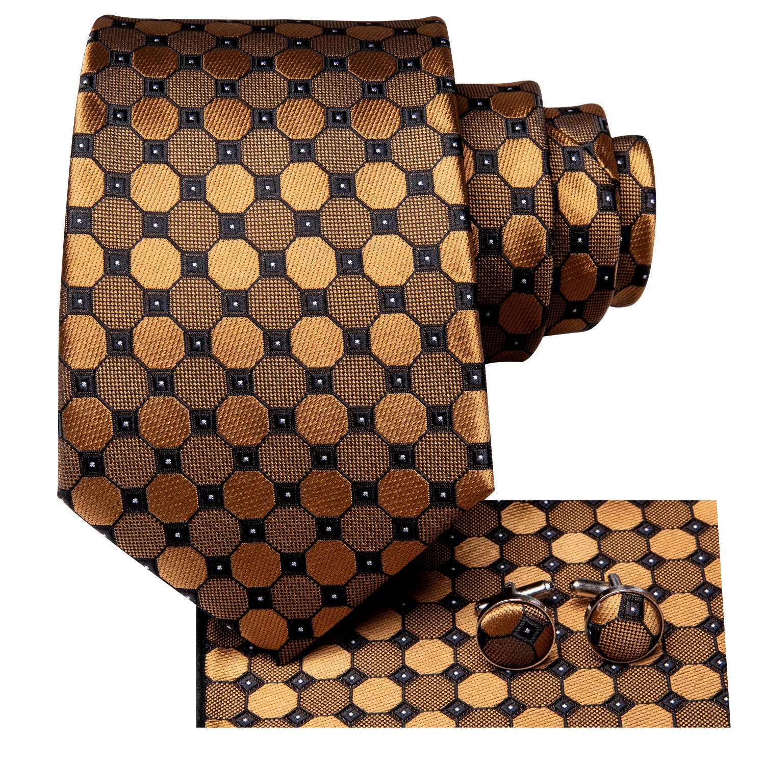 Hi-Tie Men's Golden Polka Dot Silk Necktie Pocket Square Cufflinks Set
