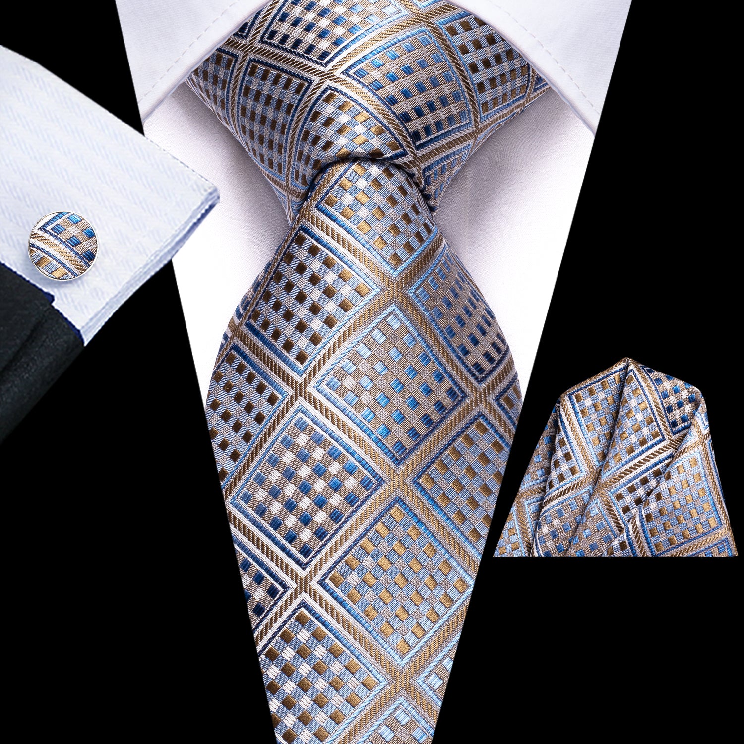 Hi-Tie Blue Tie Gold Plaid Wedding Necktie Pocket Square Cufflinks Set
