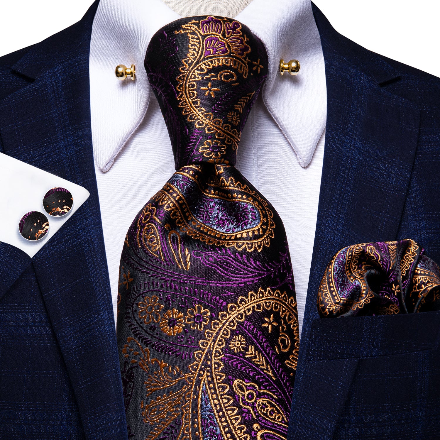 Hi-Tie Purple Paisley Silk Men's Tie Hanky Cufflinks Set Collar Pin