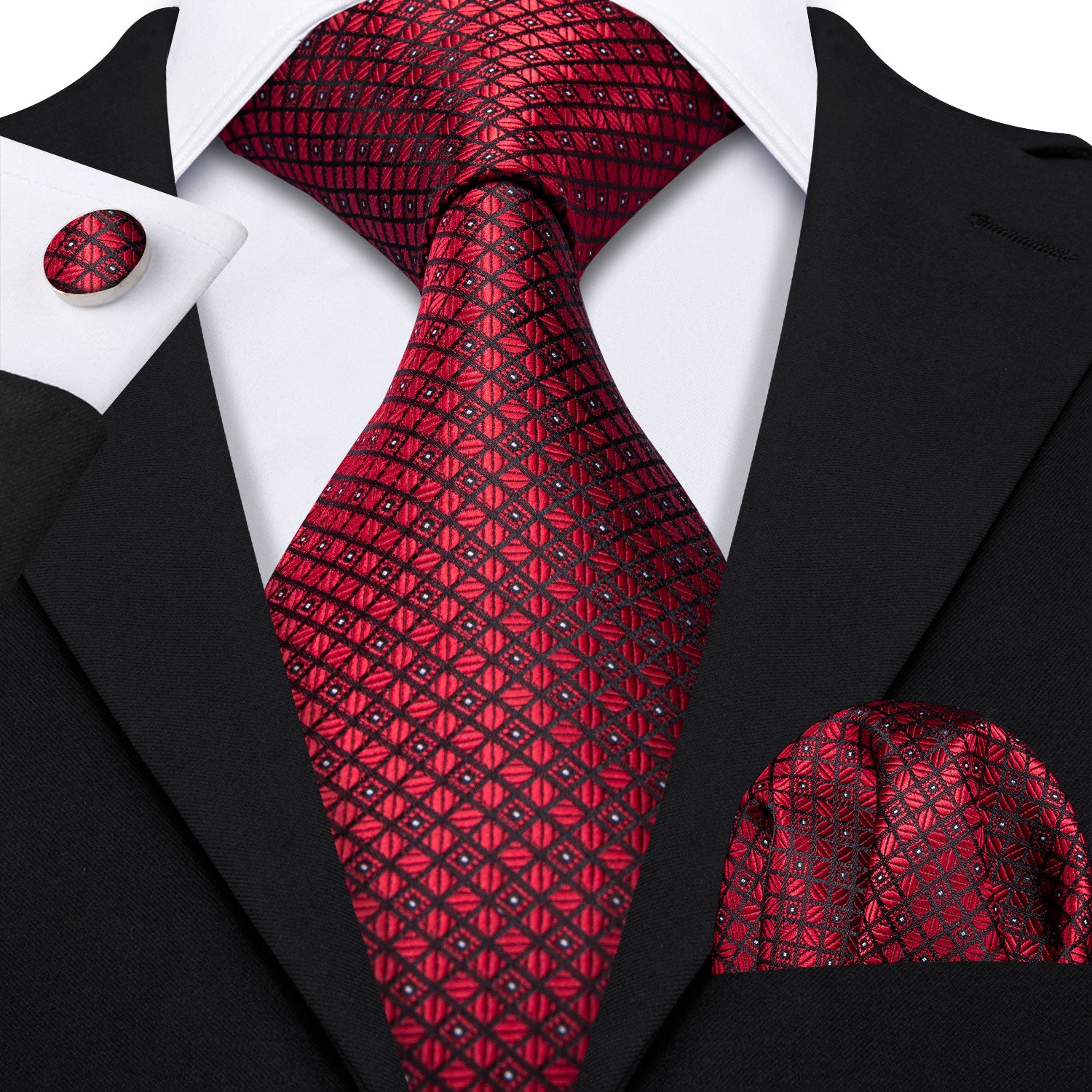 Hi-Tie Dark Red Tie Plaid Mens Red Necktie Handkerchief Cufflinks Set