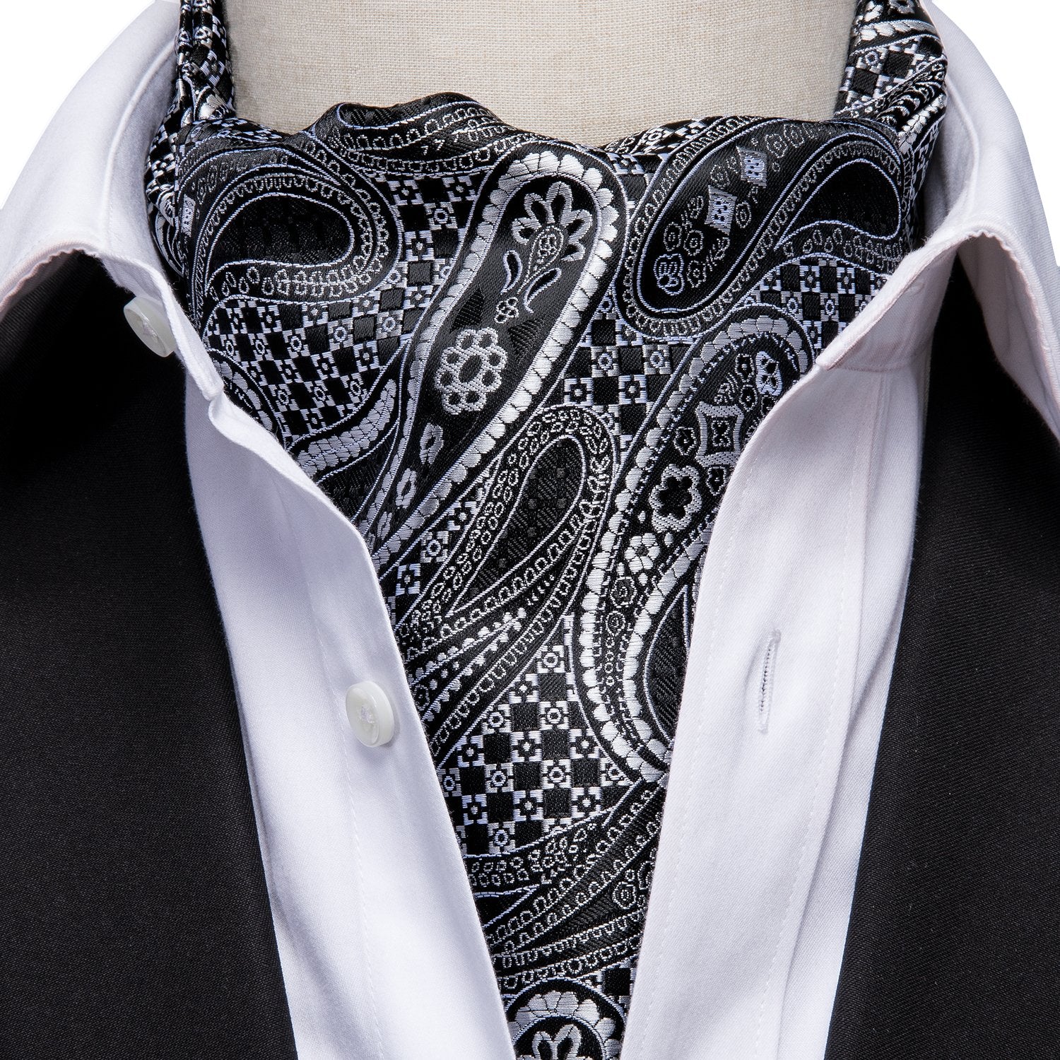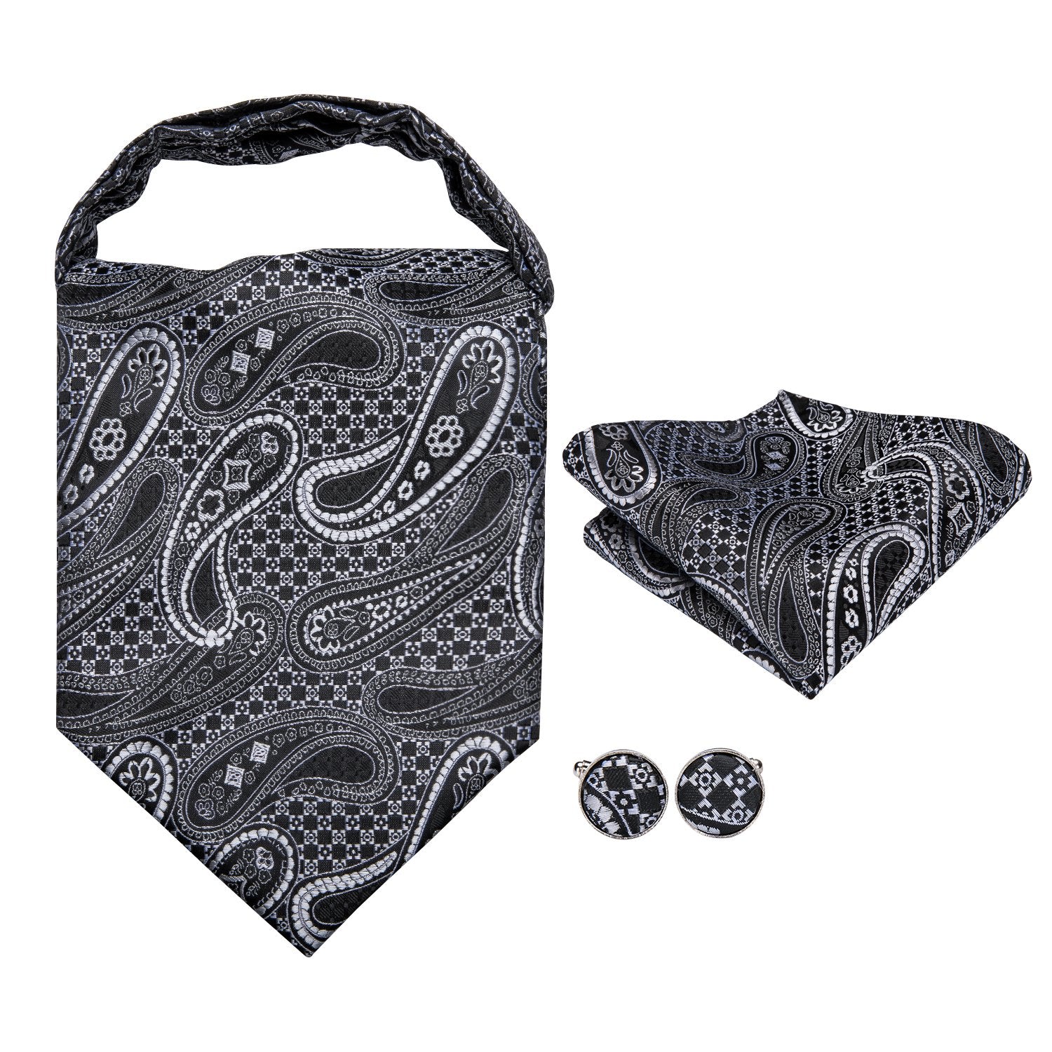 Hi-Tie Black Paisley Silk Ascot Tie Pocket Square Cufflinks Set