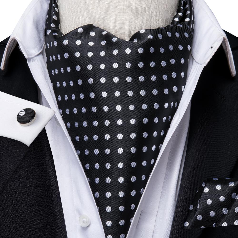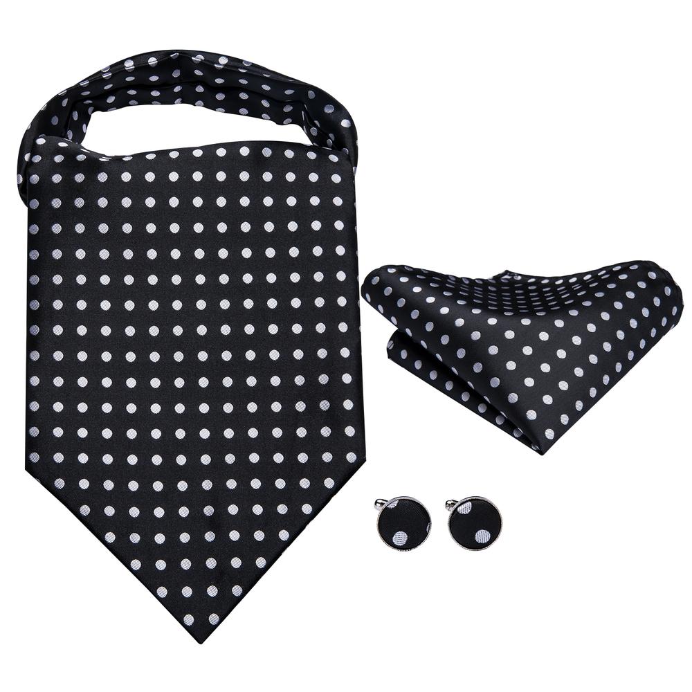 Hi-Tie Ascot Neck Tie Black White Polka Dot Ascot Hanky Cufflinks Set