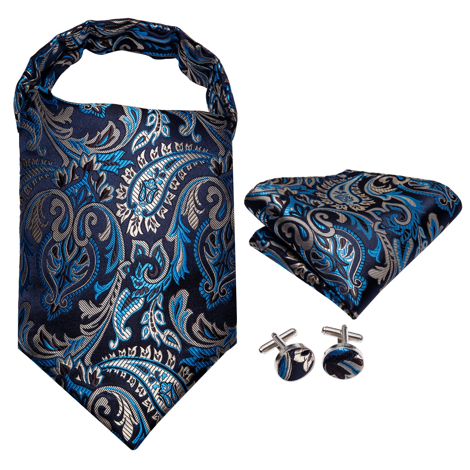Blue Brown Paisley Ascot Pocket Square Cufflinks Set