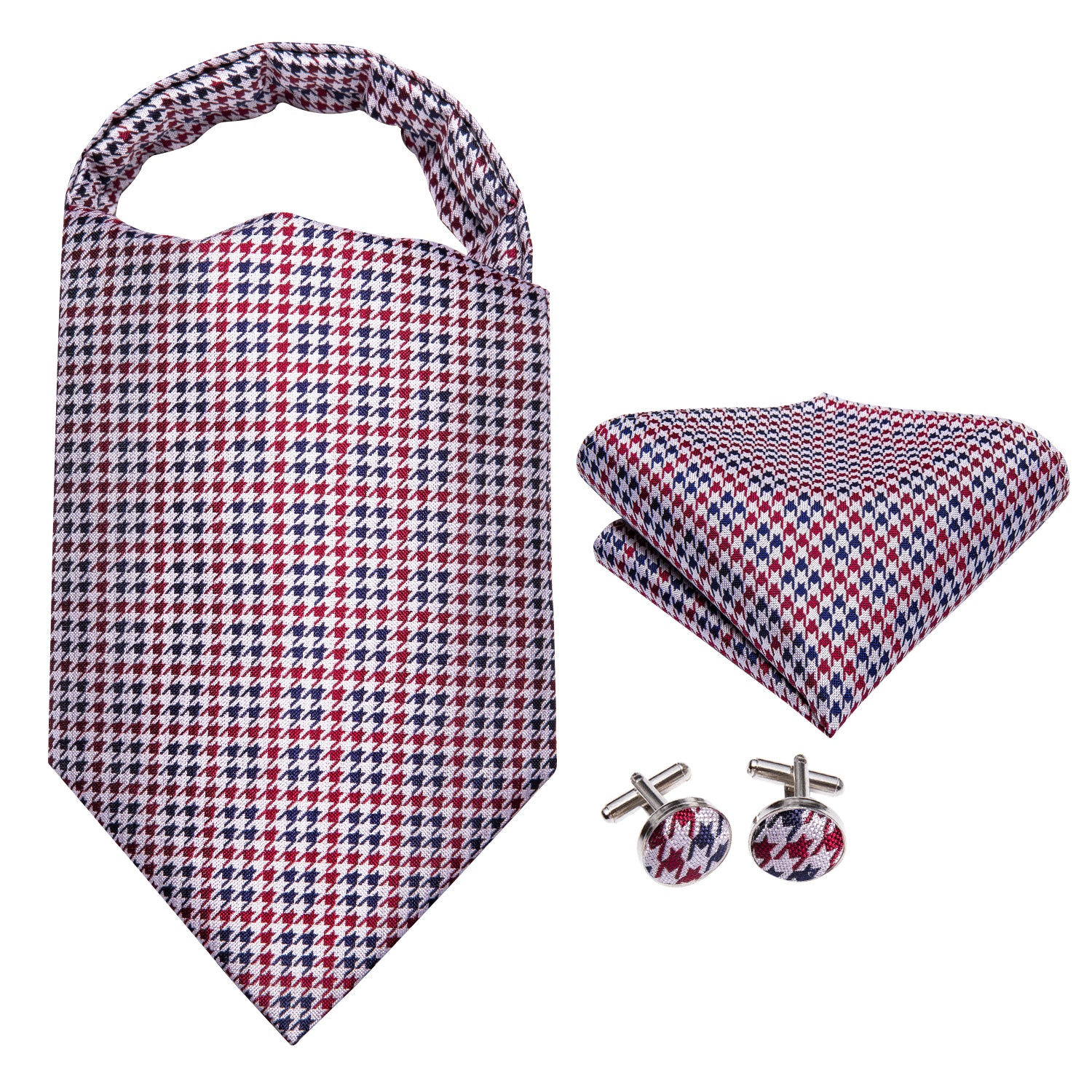 Hi-Tie Red Blue Houndstooth Plaid Silk Ascot Pocket Square Cufflinks Set