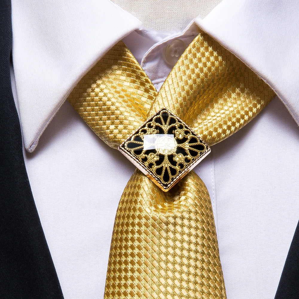 Hi-Tie Necktie Gold Solid Poirot Tie Ring Pocket Square Cufflinks Set