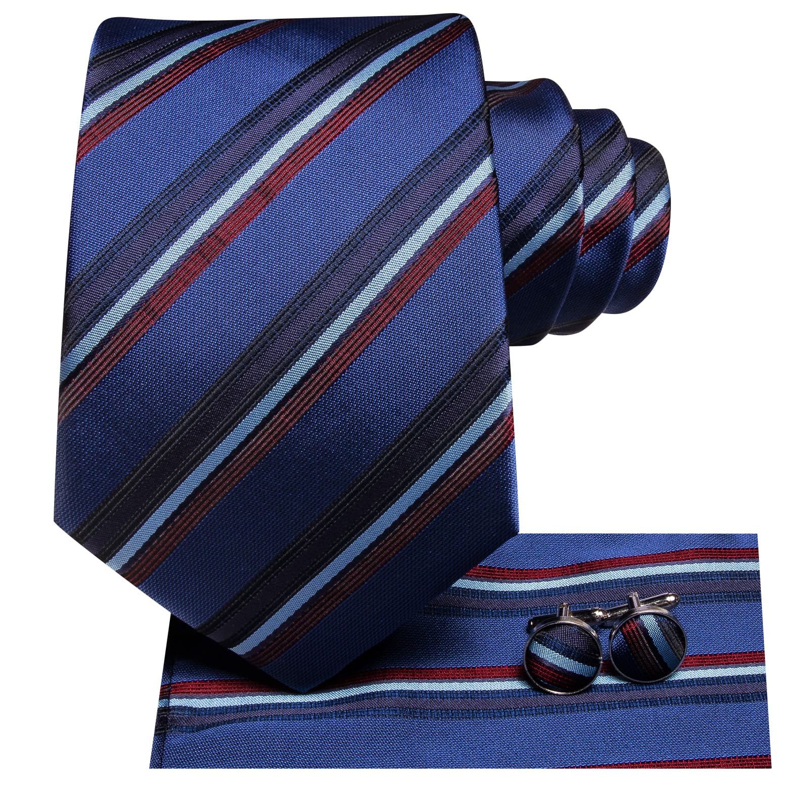 Classic Blue Red Striped Silk Men's Tie Pocket Square Cufflinks Gift Box Set