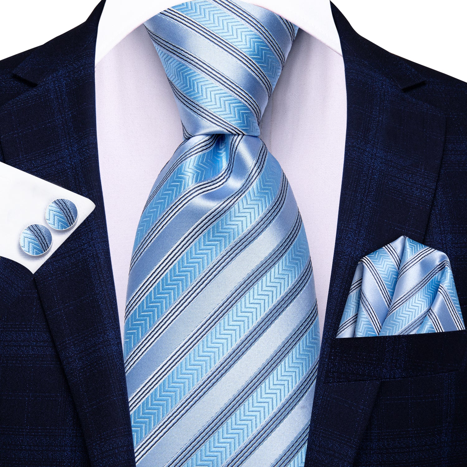 Hi-Tie Black Sky Blue White Striped Tie Pocket Square Cufflinks Set