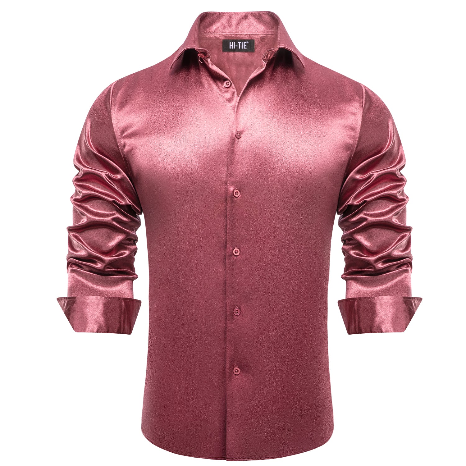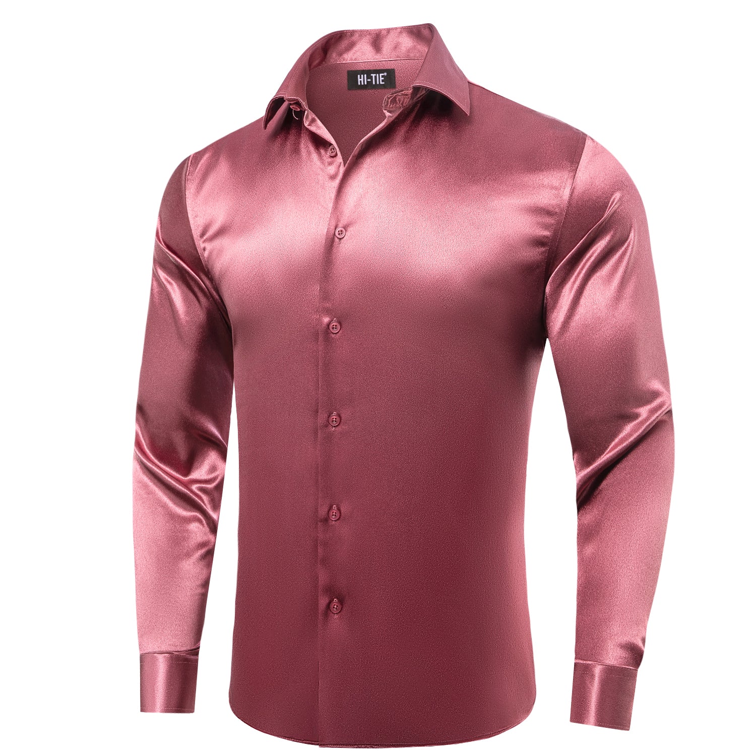 Hi-Tie Rose Pink Shirt Golden Solid Silk Mens Button Long Sleeve Shirt