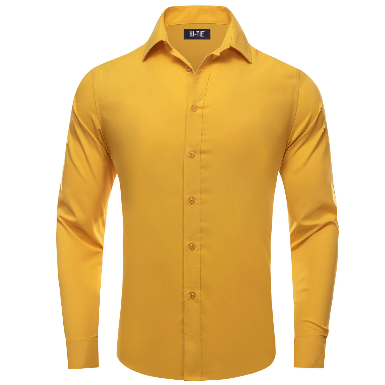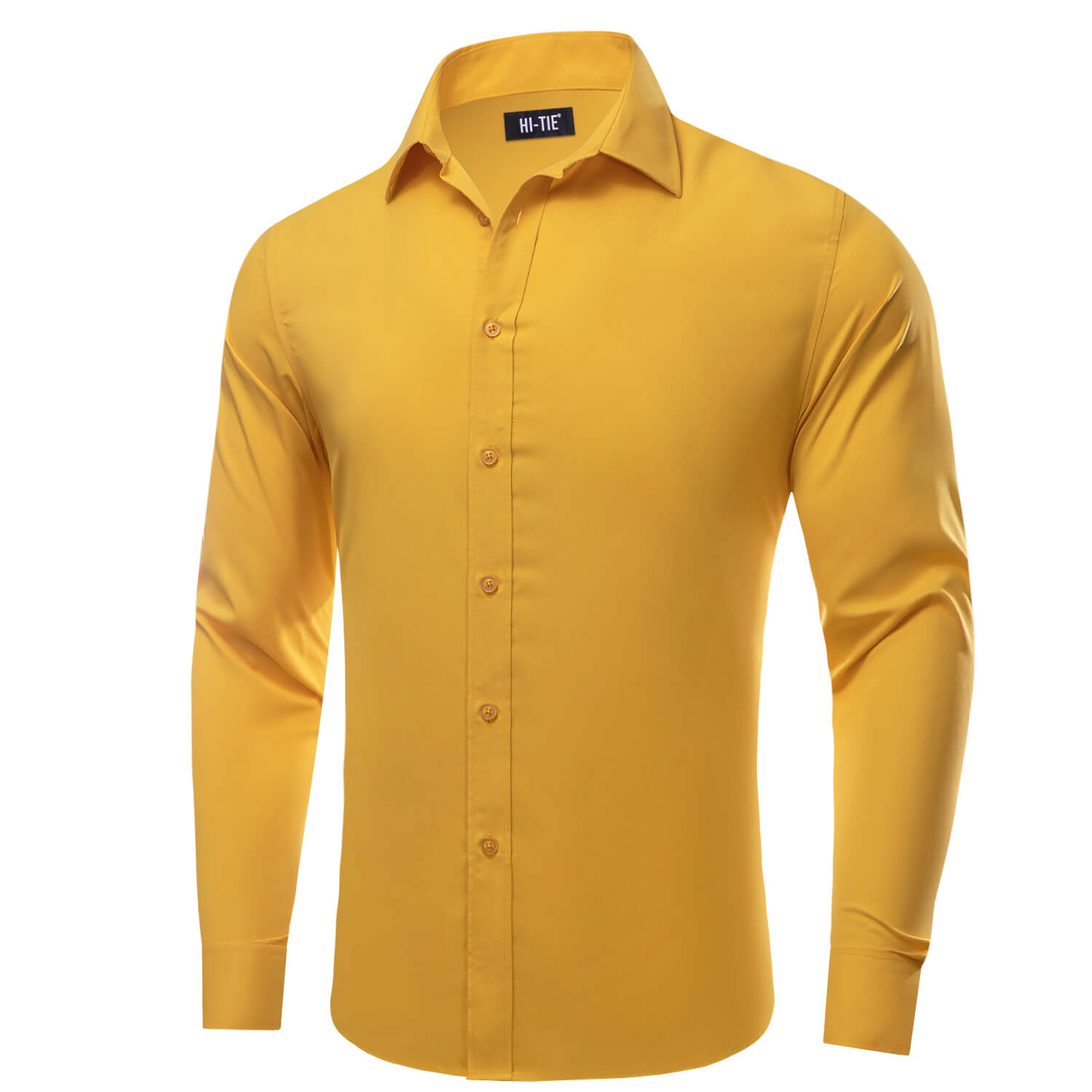 Hi-Tie Mens Dress Shirt Gold Solid Silk Button Down Shirt