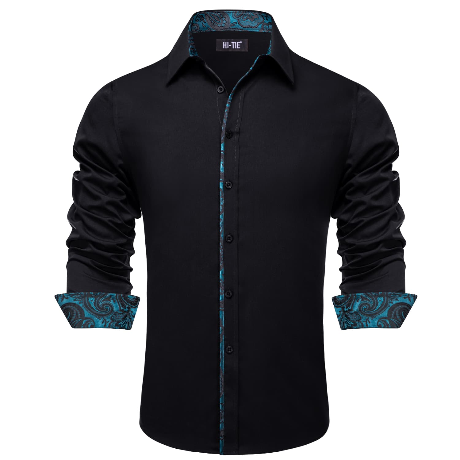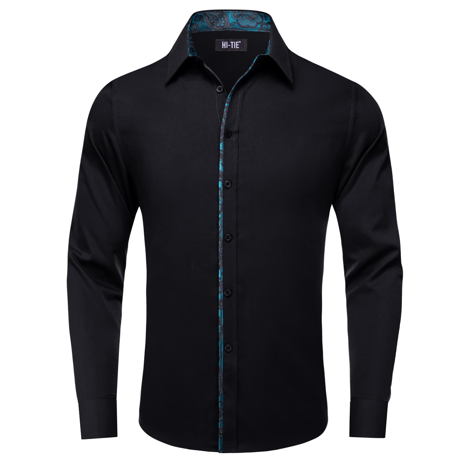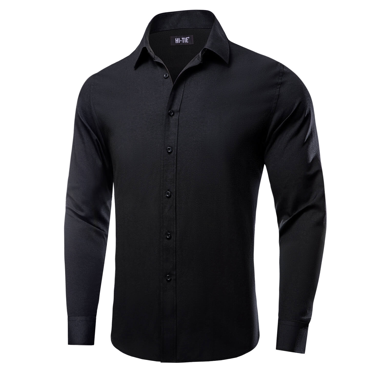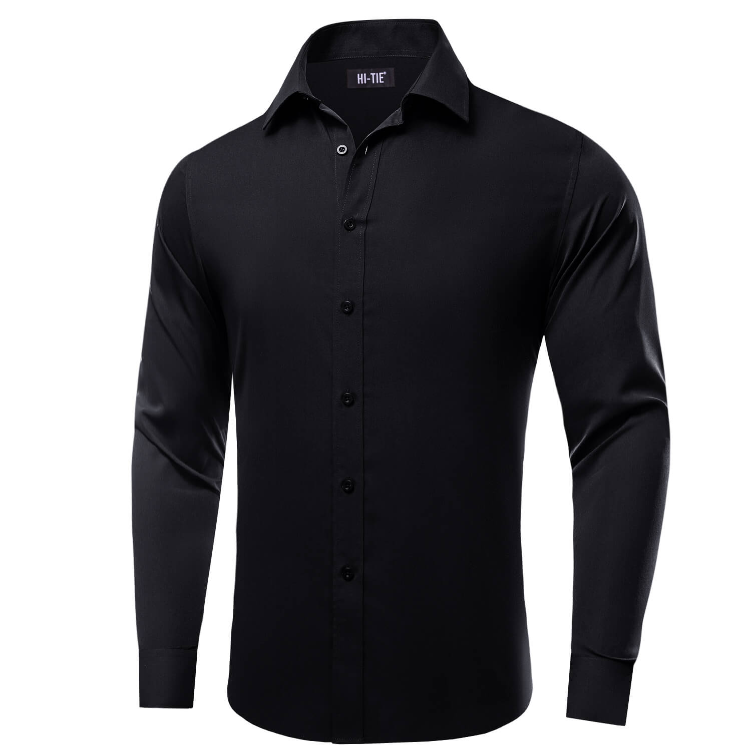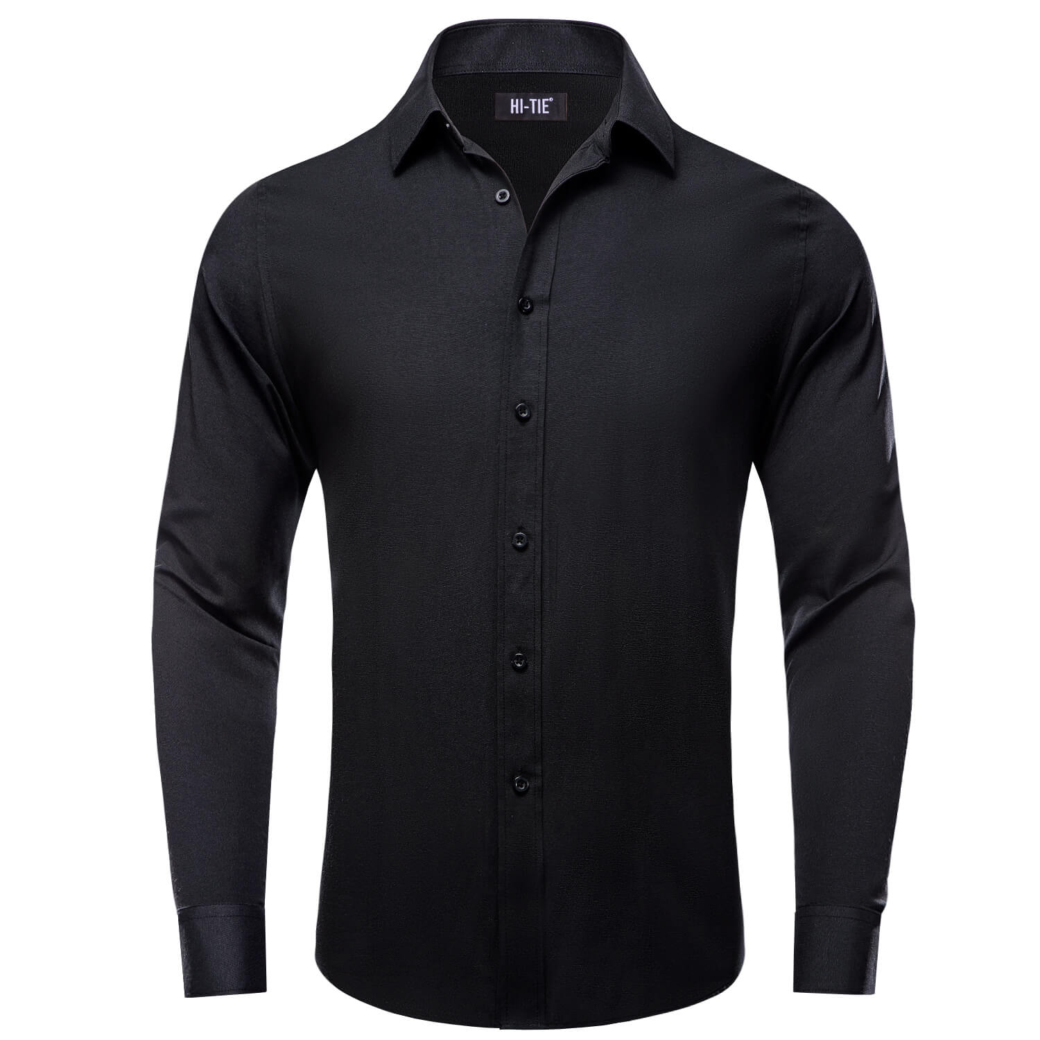 Hi-Tie Black Silk Shirt Solid Satin Men's Long Sleeve Dress Shirt