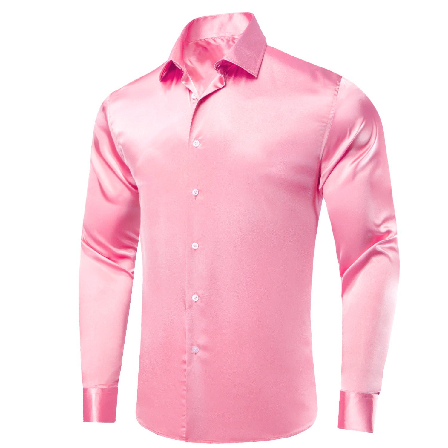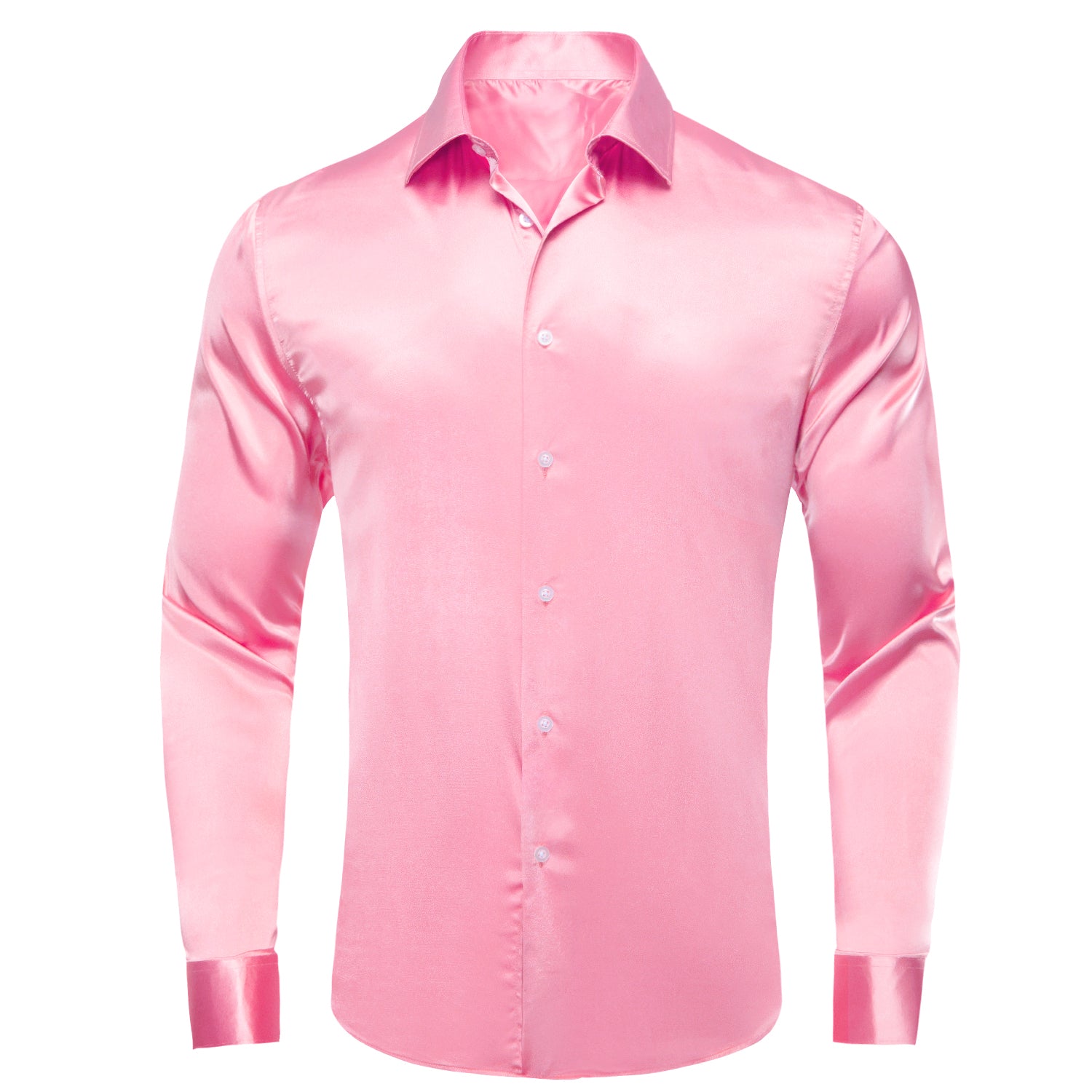 Watermelon Pink Solid Satin Silk Men Long Sleeve Dress Shirt