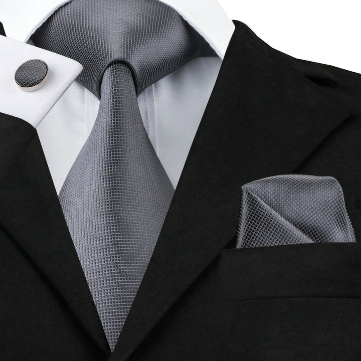 Hi-Tie Dark Grey Necktie Gray Solid Tie Handkerchief Cufflinks Set