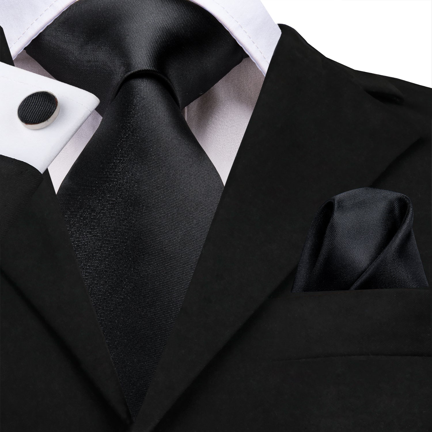 Hi-Tie Black Wedding Necktie Solid Men Tie Pocket Square Cufflinks Set