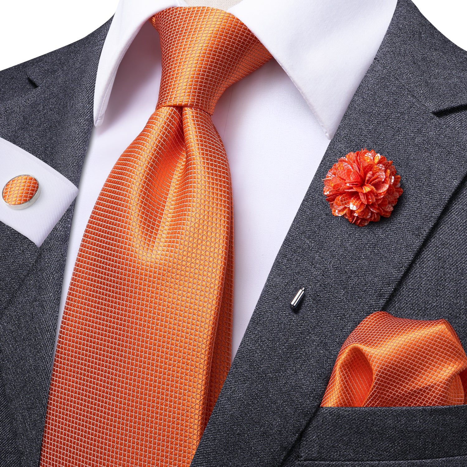 Orange Solid Tie Tie Handkerchief Cufflinks Set with Wedding Brooch