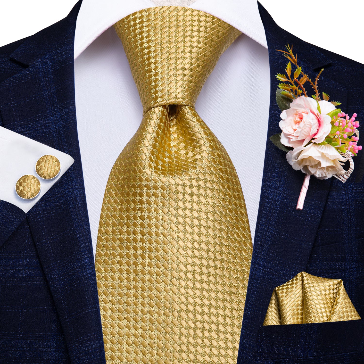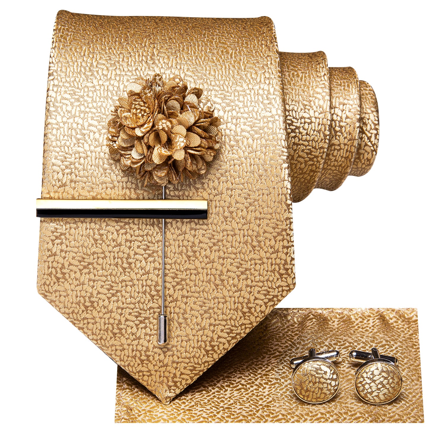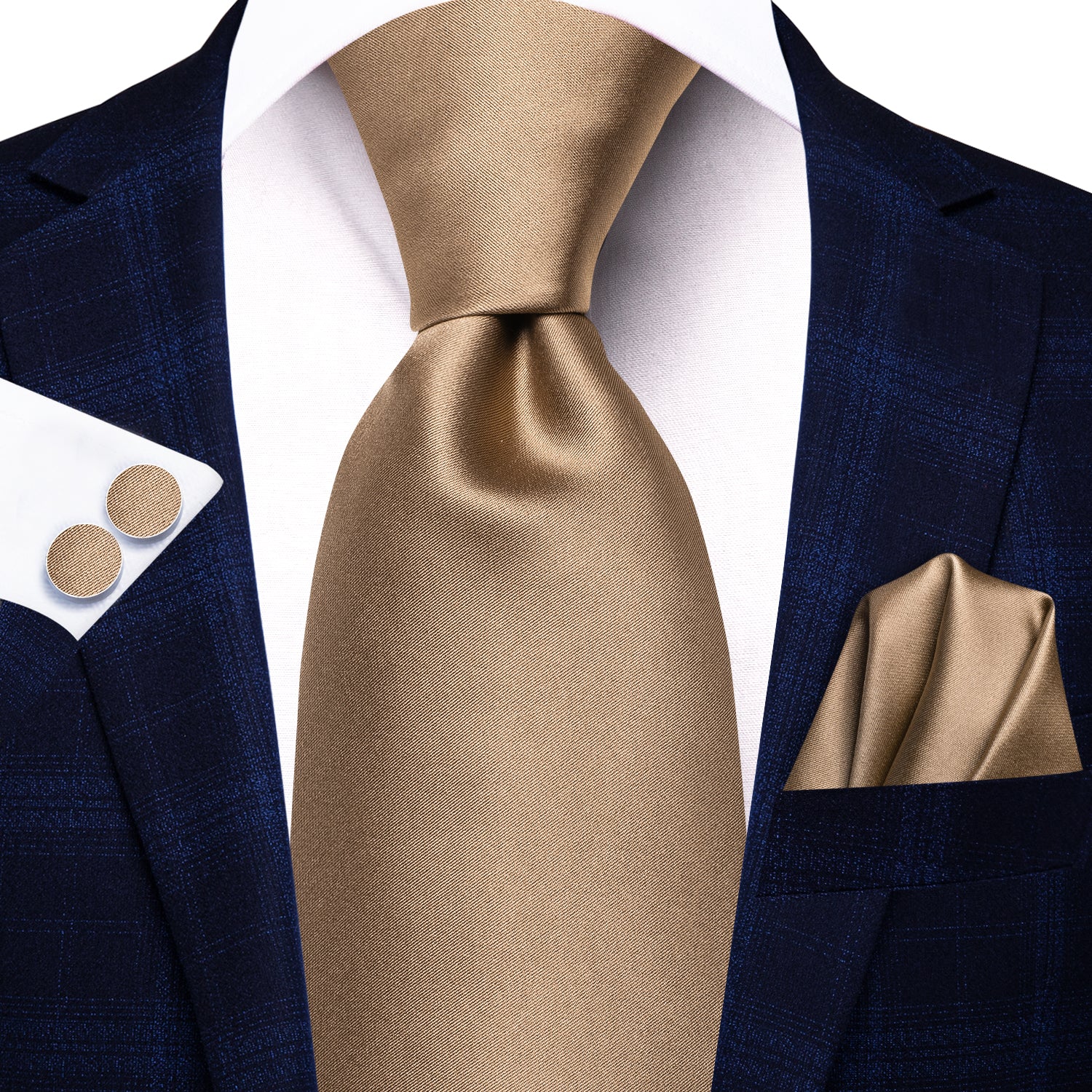 Champagne Golden Solid Tie Handkerchief Cufflinks Set with Wedding Brooch