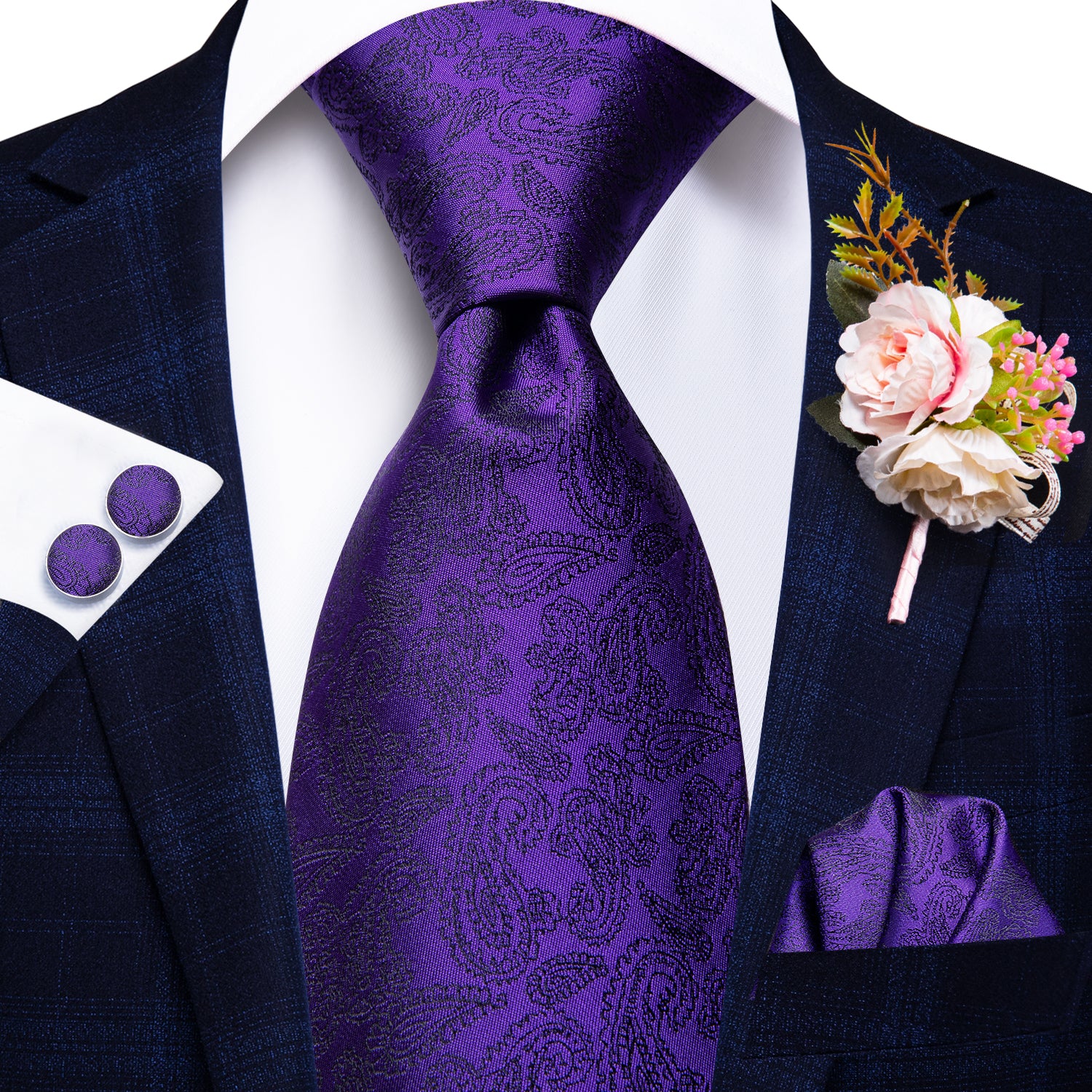 Purple Solid Tie Tie Handkerchief Cufflinks Set with Wedding Brooch