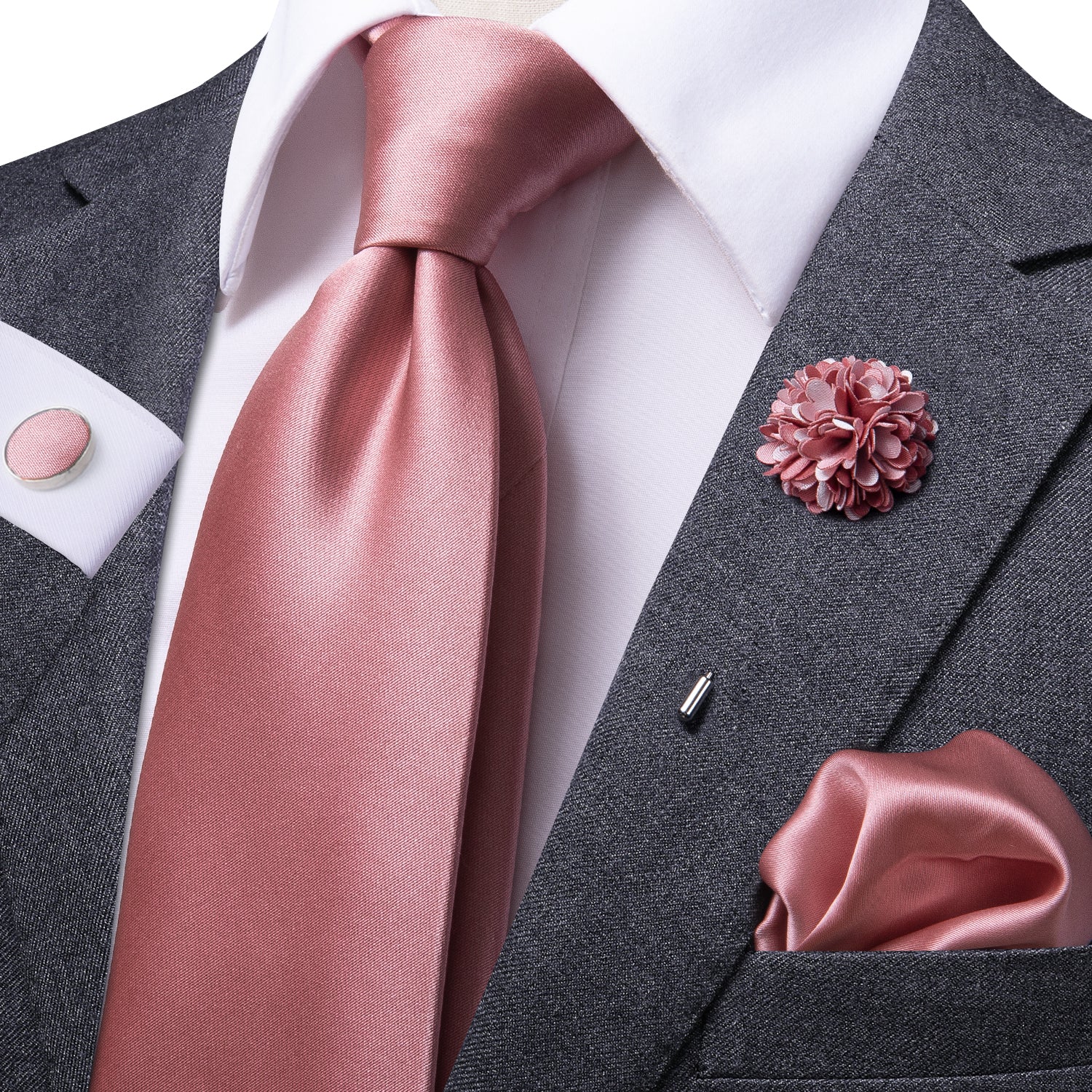 Pink Solid Tie Pocket Square Cufflinks Set with Wedding Brooch