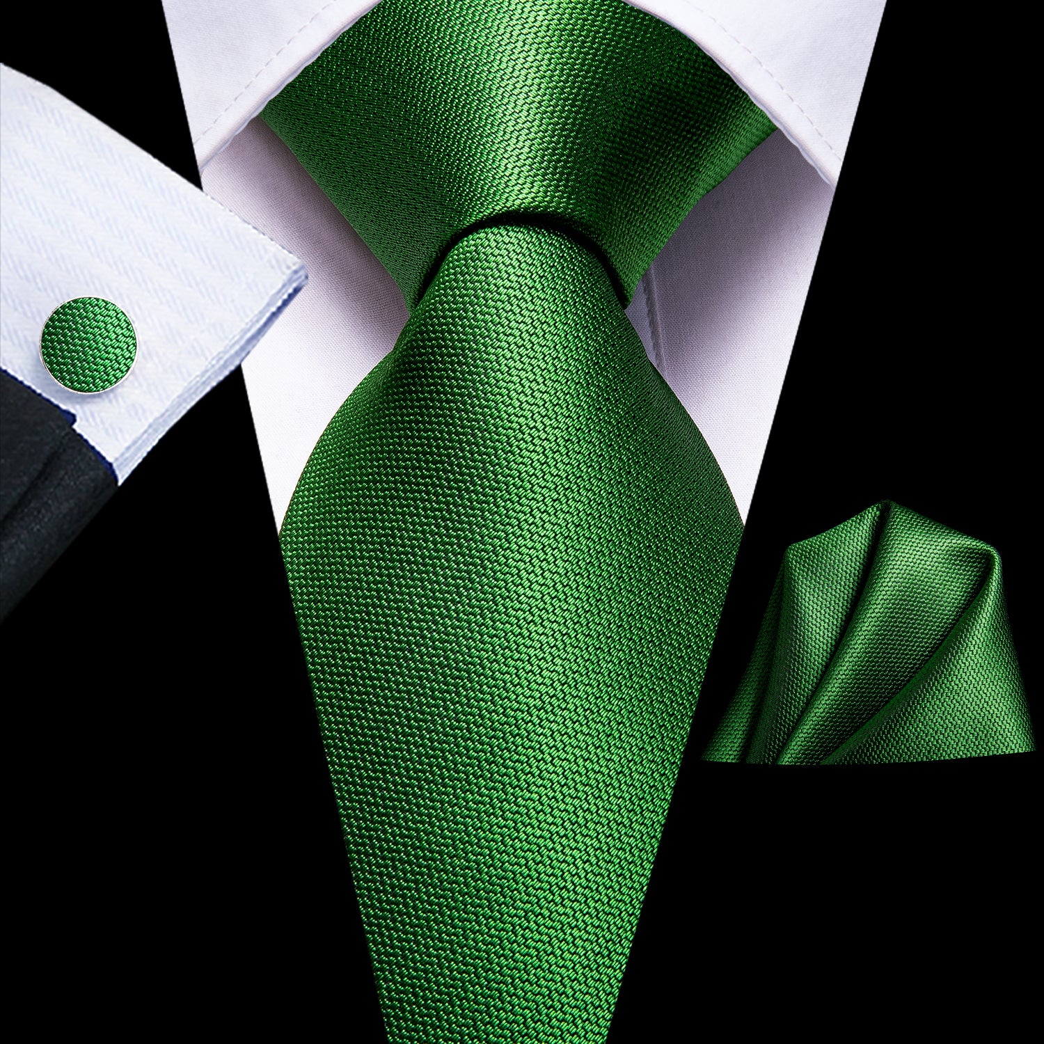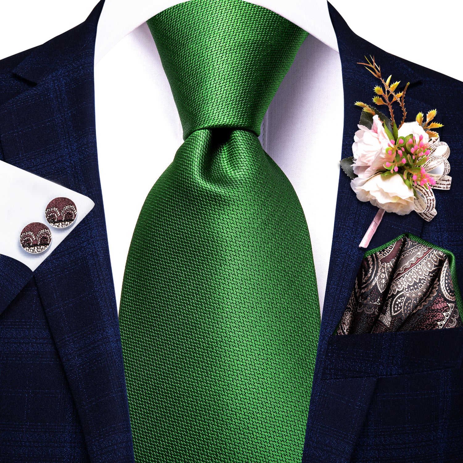 Green Solid Tie Pocket Square Cufflinks Set with Wedding Brooch