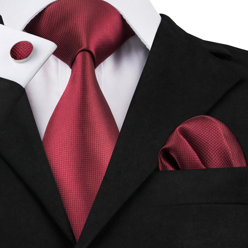 Hi-Tie Solid Red Necktie Pocket Square Cufflinks Set for Men