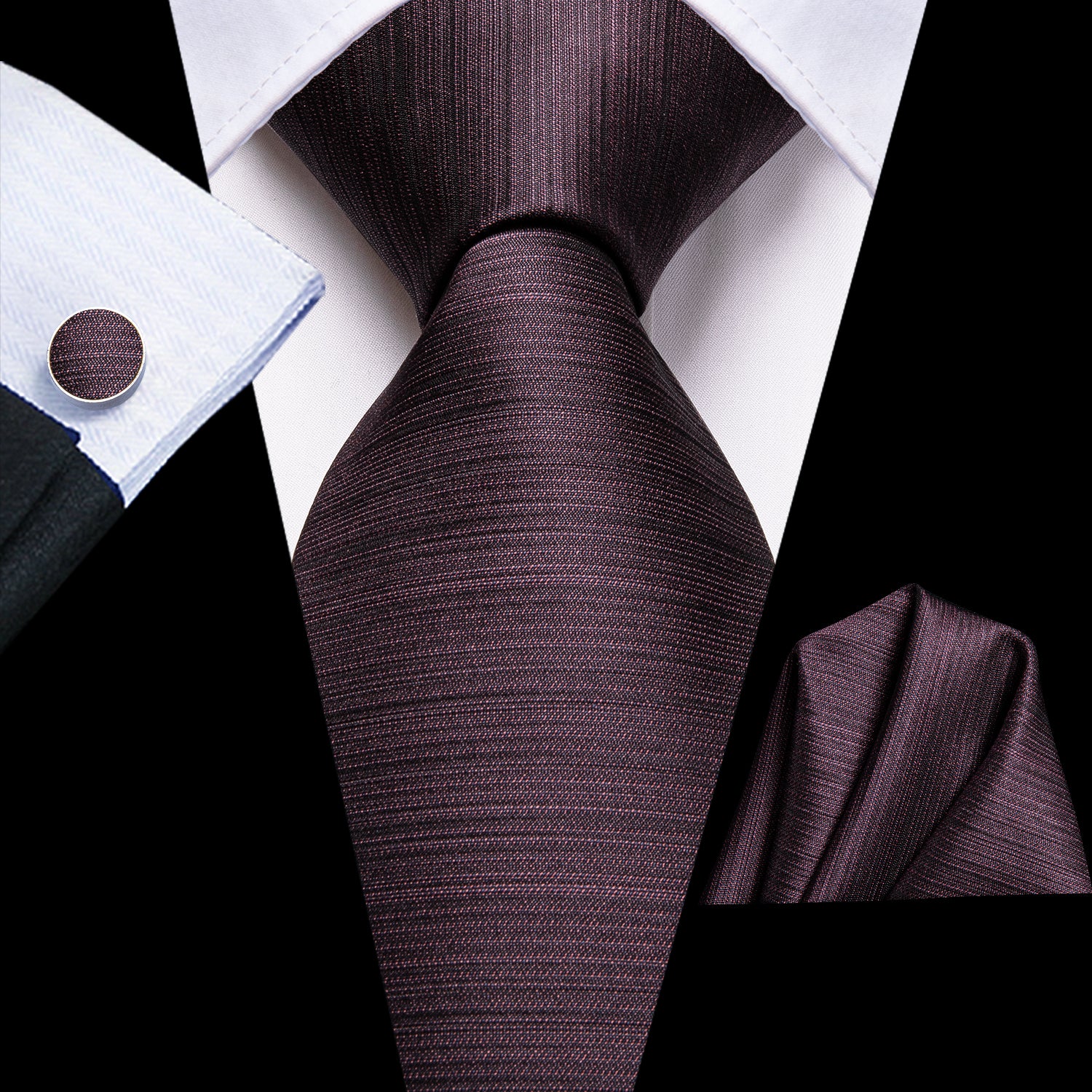 Hi-Tie Eggplant Red Brown Solid Necktie Pocket Square Cufflinks Set